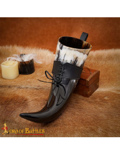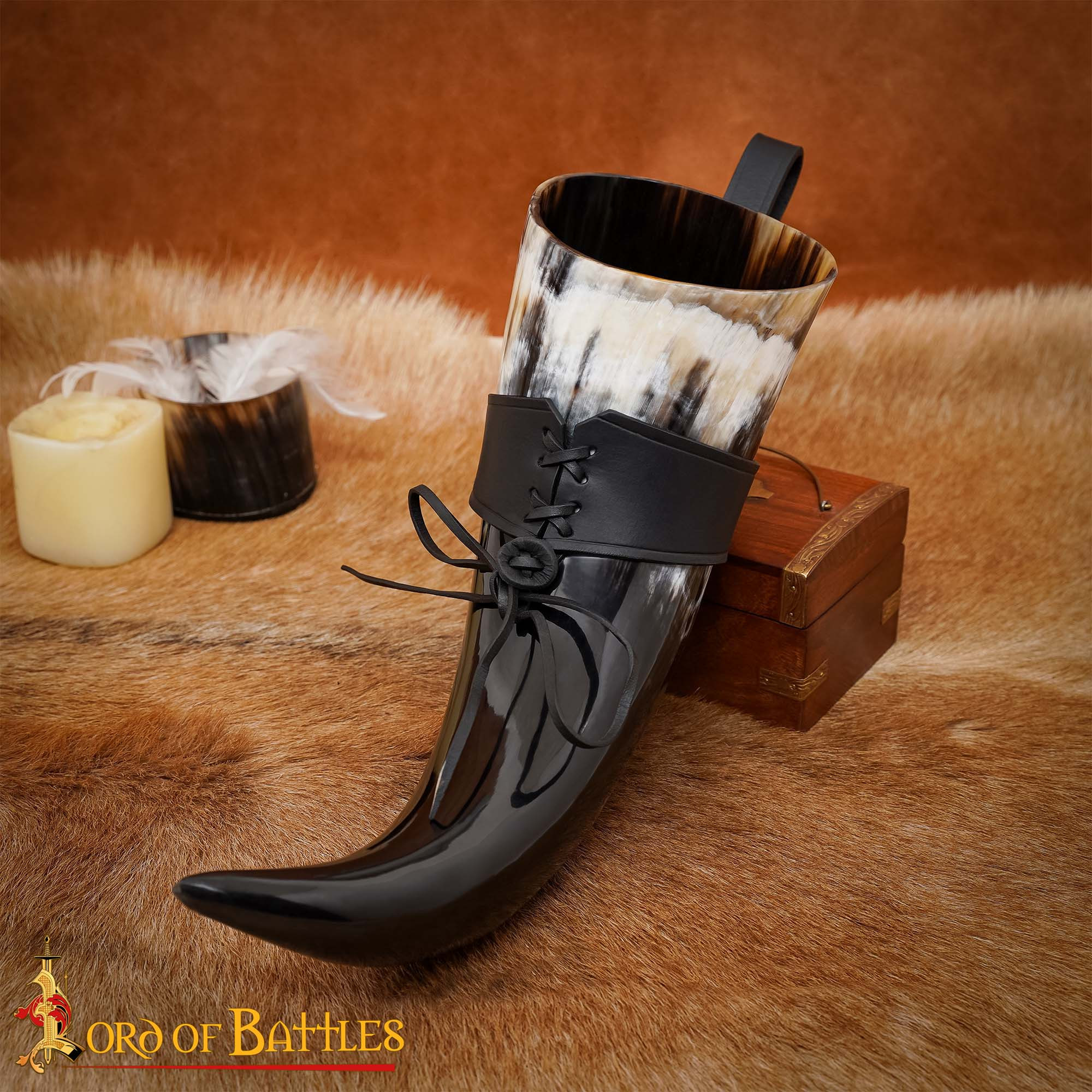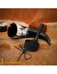 Celebrate your victories Viking style with our drinking horn accompanied by a black leather baldric! This authentic ox horn, meticulously handcrafted, is the perfect companion for enjoying mead or your favorite drink containing up to 20% alcohol, in its generous 250 ml size.