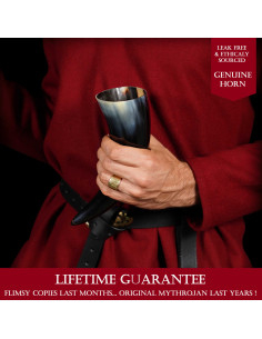 Get ready to enjoy your drinks in authentic style with this Viking horn from Mythrojan! With a capacity of 800ml, it is handcrafted using genuine horn, polished and sealed to ensure it is completely airtight. Each horn is unique, created using craftsmanship techniques that highlight the beauty and sturdiness of the material. Natural variations in colour and shape ensure that each piece is special.