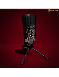 The Viking drinking horn model Mjolner, with a capacity of 400 ml, is the perfect piece to accompany you at your medieval events, banquets, and historical reenactments. Its generous size offers the ideal balance: it is easy to carry and has enough capacity to quench the thirst of the bravest Viking warriors.