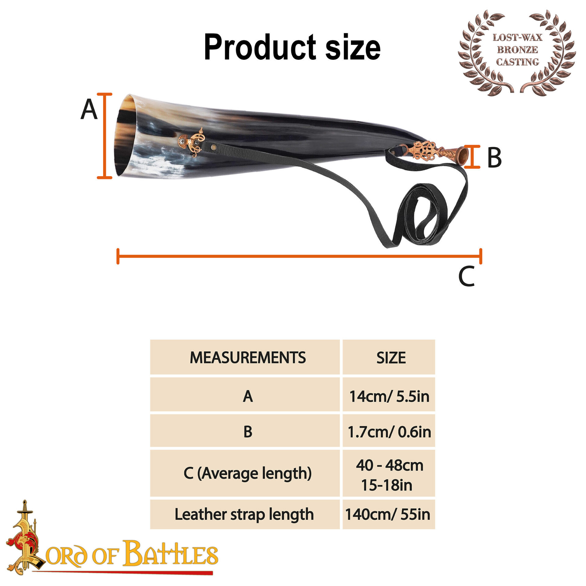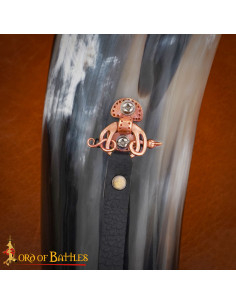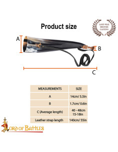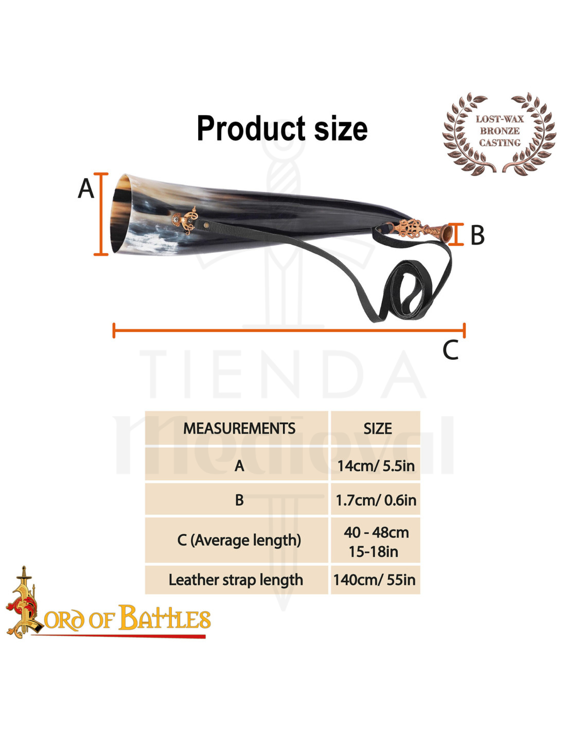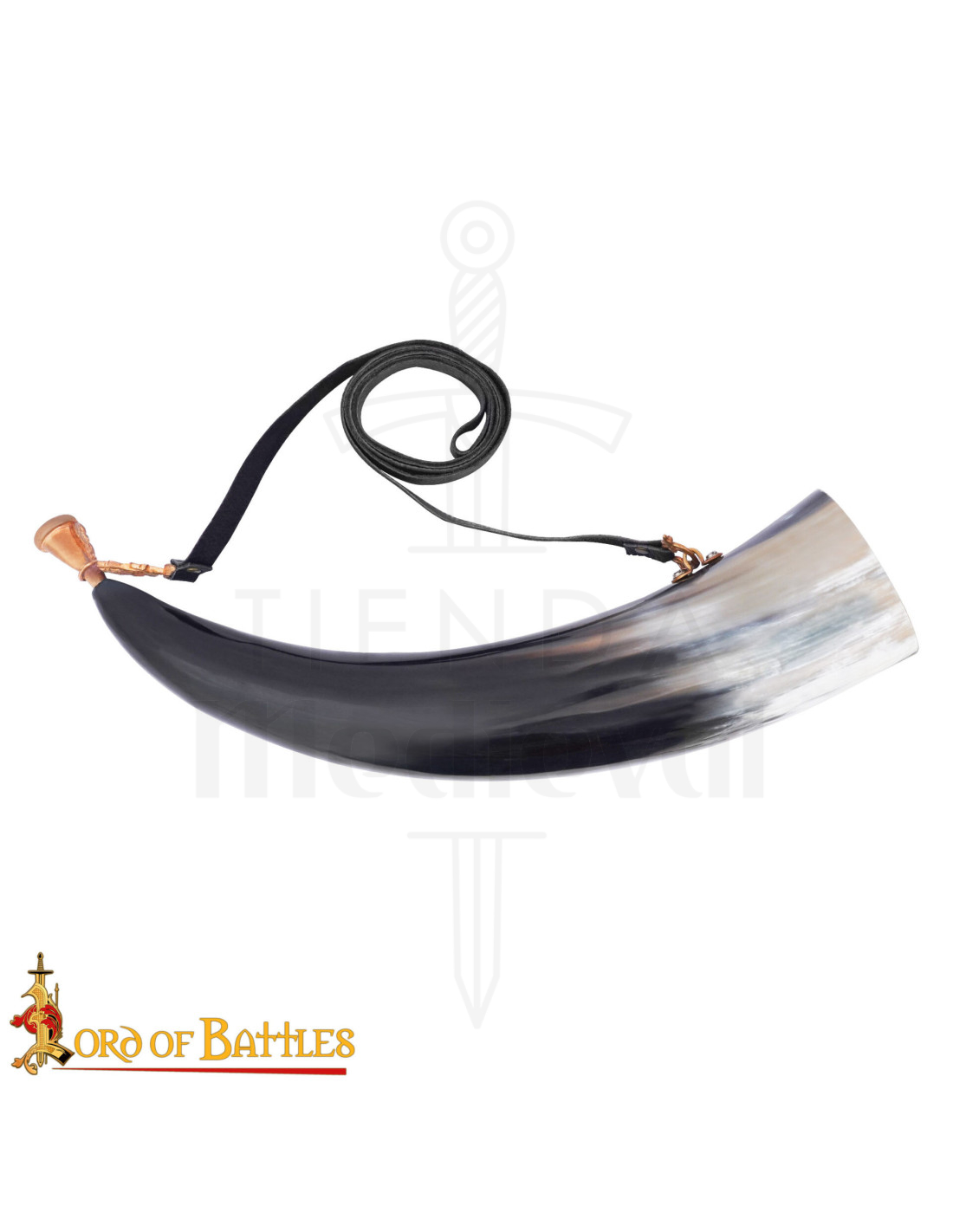 The curved design enhances grip and ergonomics when playing or carrying, and the adjustable black strap with metal clasp makes the horn a comfortable accessory to wear, ready for themed marches, performances, or historical gatherings. Its polished surface facilitates cleaning and preserves the natural character of the material without losing authenticity.