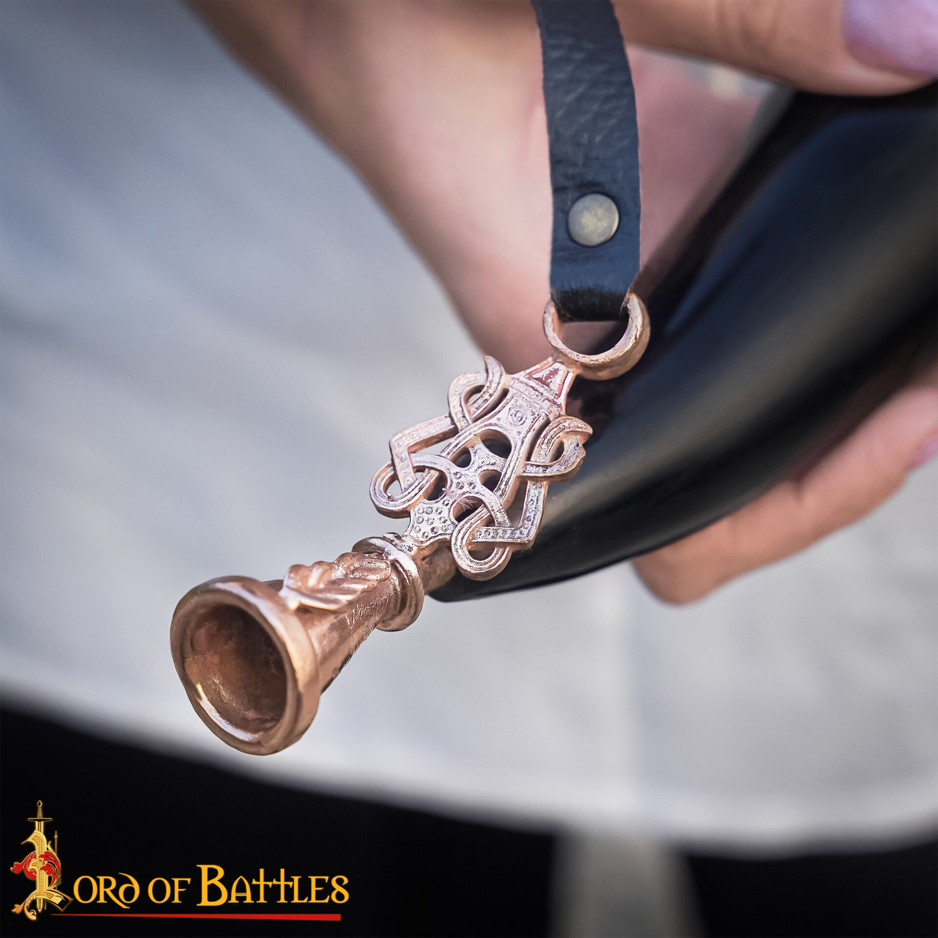 Handcrafted from natural ox horn, its polish highlights a unique gradation of tones ranging from deep black to warm cream, ensuring each piece is unrepeatable and striking. The brass mouthpiece, created using the ancient lost-wax technique, features intricate Nordic knotwork with a level of detail that adds presence and elegance, while the patina finish gives it an aged shine that stands out in exhibitions and ceremonial events.