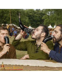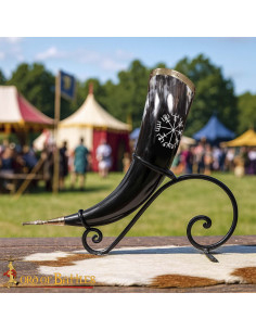 Its maintenance is simple: hand wash with lukewarm water and careful drying to preserve its shine; occasionally, polishing with natural oil prolongs its appearance. If you're looking to buy a Viking drinking horn with Runa Vegvisir, brass details, this set is the choice for those who want an object with presence, functionality, and a story to tell.