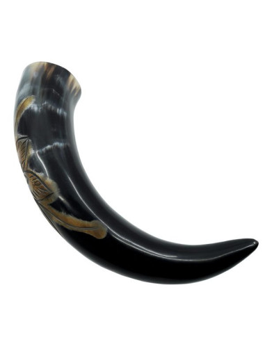 This horn combines the rustic presence of polished dark material with a central white motif evoking Viking symbols, while a woven golden edge finishes the mouth with a ceremonial air. The base incorporates a clear stopper or funnel with carved detail that adds contrast and a refined finish, all in a conical and curved silhouette designed to feel natural in the hand.