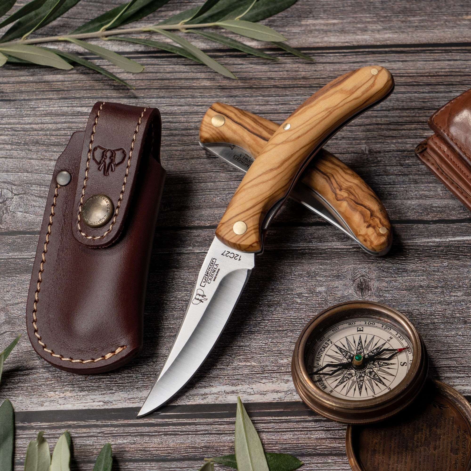 The satin-finished natural olive handle adds a touch of elegance and authenticity to this razor. In addition to its attractive appearance, the natural olive handle provides an ergonomic, non-slip grip, ensuring safe handling even in difficult conditions. The Cazorla knife is accompanied by a brown leather sheath, which not only offers additional protection, but also complements the classic style of the knife.