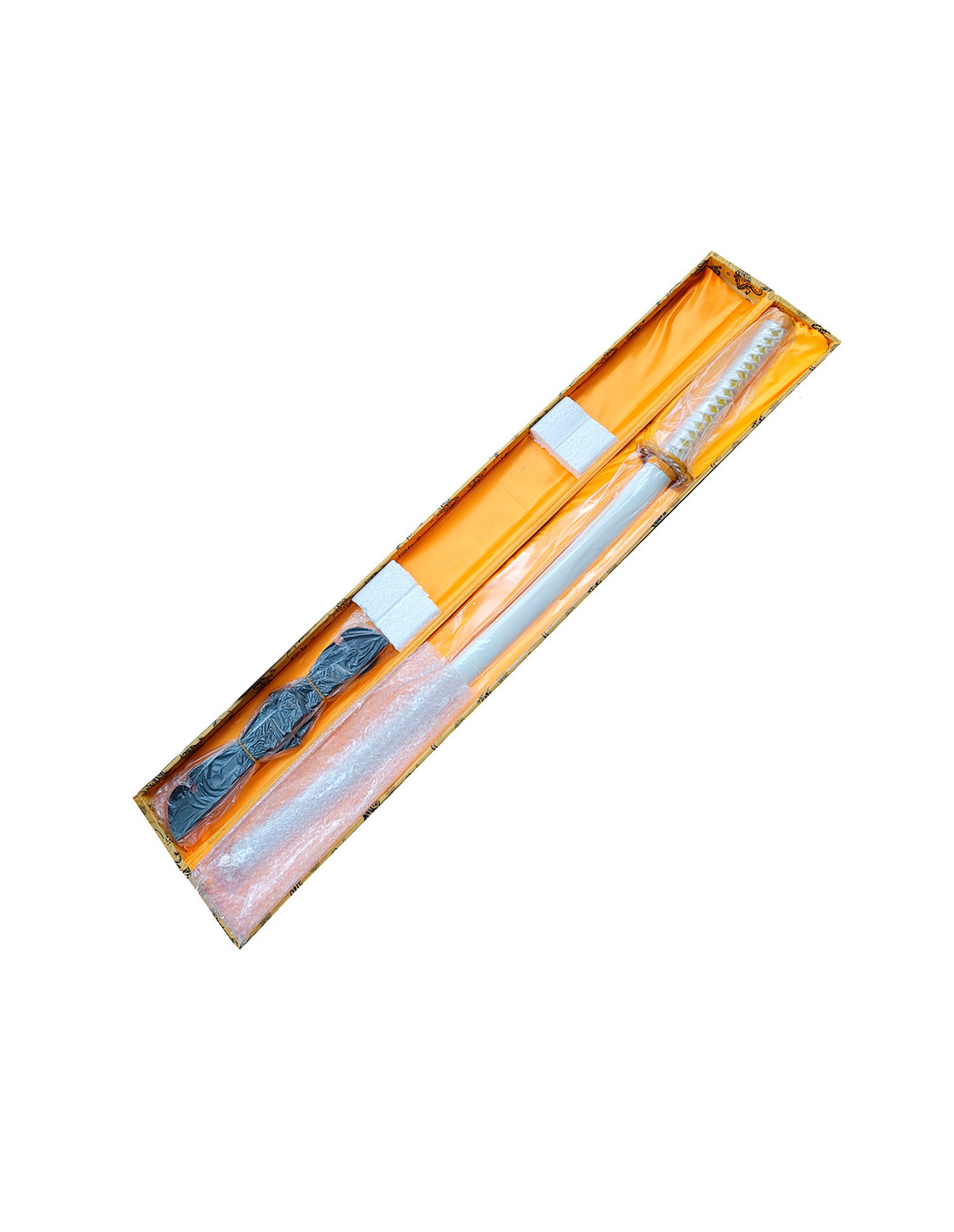 It includes a white synthetic leather sheath that protects the blade and complements the design, along with a wooden box lined with decorative fabric for display.