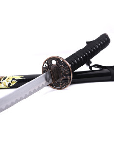 The black lacquered wooden scabbard, adorned with a printed dragon, gives it a unique and mysterious touch. This detail makes this katana more than just a weapon, turning it into a decorative piece that captures the attention of all who see it.