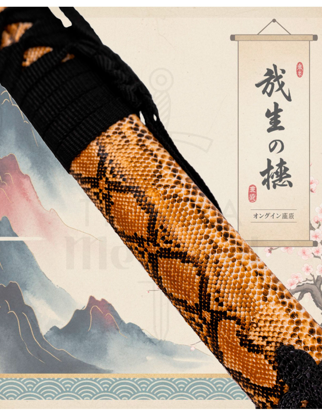 The sheath combines durable black Cordura with a snake skin imitation in light brown tones, decorated with dark patterns that reproduce natural scales, and black metal fittings that ensure a firm hold. This combination facilitates transport and keeps the piece protected, while also enhancing its distinctive aesthetic.