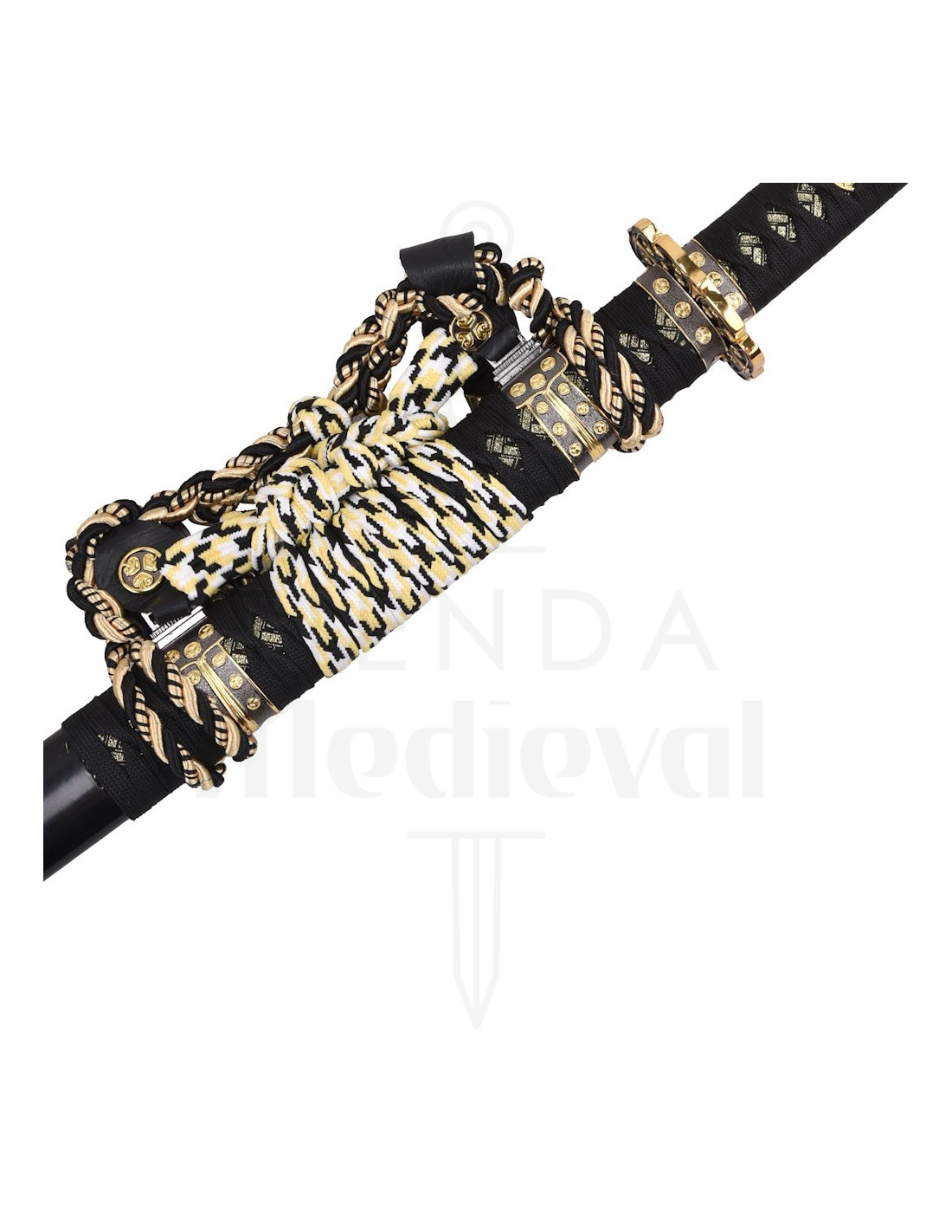 The black wooden scabbard with golden finishes and the braided cord in white, black, and gold tied in an ornamental design transform the set into a piece ready for display. Its presence on a wall, on a stand, or as a centerpiece in a showcase adds personality without the need for additional elements. It is practical to mount and is appreciated in both modern environments and Asian-inspired decor.