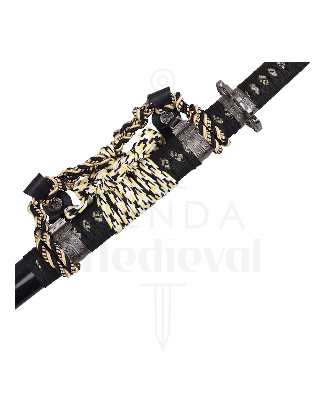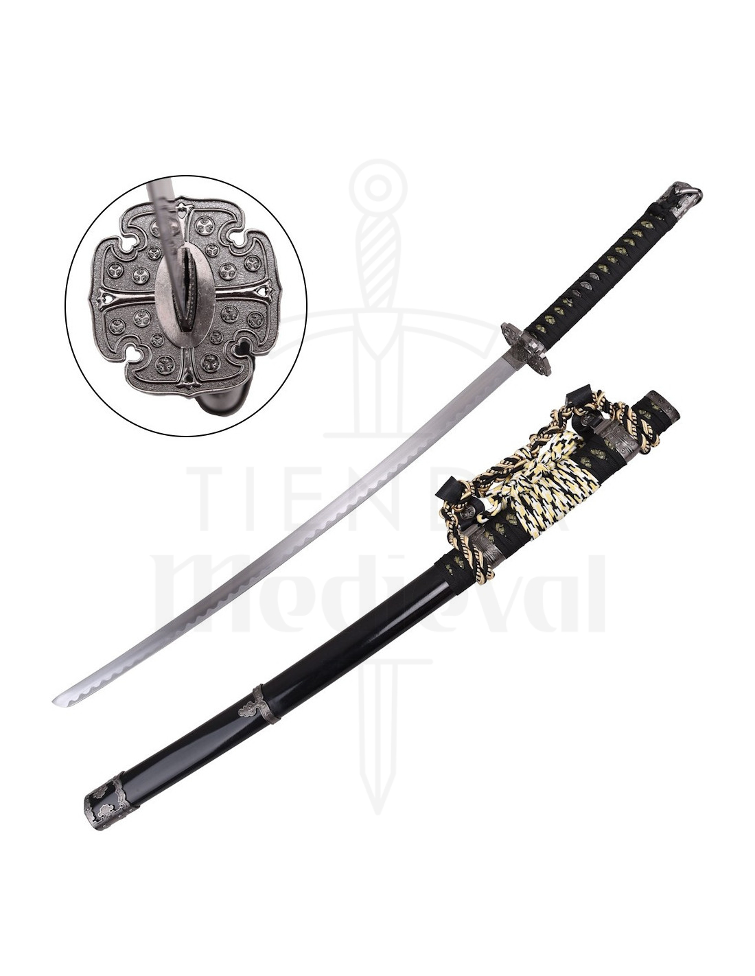 The metallic guard, adorned with symmetrical symbols and shapes, adds a touch of distinction that turns the katana into a decorative element with history, while the ornate design reinforces its elegance without compromising visual coherence.