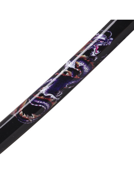 The scabbard, made of glossy lacquered wood, displays a graphic dragon on one side and a black cord tied at the top, details that make the whole piece perfect for hanging, displaying, or gifting. The shine of the lacquer and the dragon motif create a balance between sobriety and drama, ideal for those seeking a characterful piece.