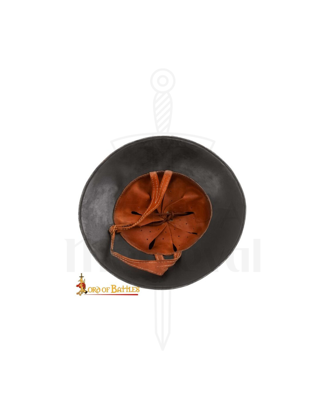 This helmet offers superior protection against downward blows, arrows, and debris, thanks to its wide-brimmed design that deflects impacts without obstructing your vision. Its polished finish not only enhances its appearance on stage or in display but also facilitates maintenance, preventing premature deterioration, ensuring it looks impeccable use after use. The adjustable leather interior suspension comfortably cradles the head, reducing fatigue during long reenactment or shooting sessions and keeping the helmet secure during intense movements.