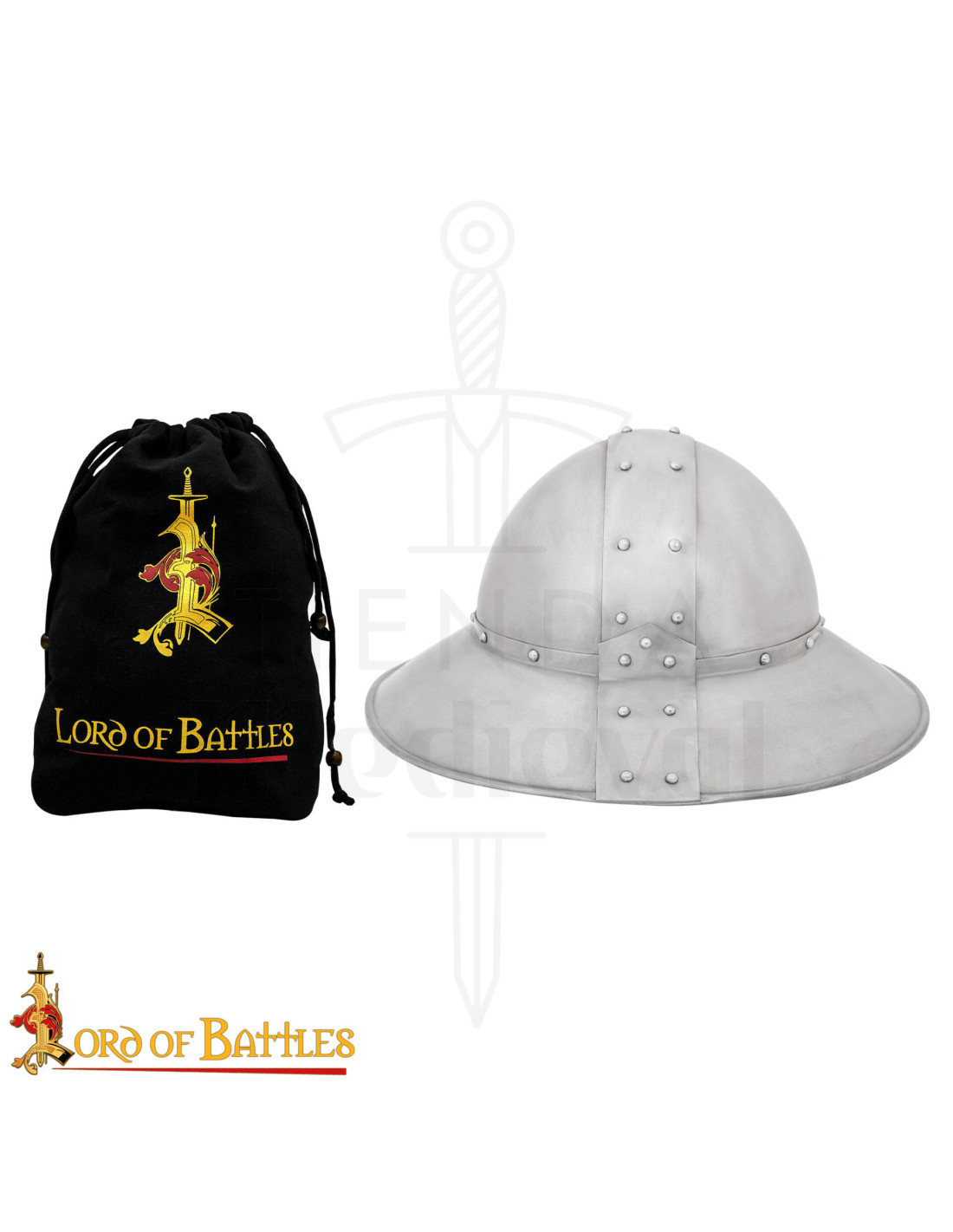 Each piece is handcrafted and riveted, with reinforced vertical and horizontal bands that enhance the structural integrity of the helmet, providing robustness and an authentic silhouette from the 15th century, without sacrificing the aesthetic presence you seek for your collection or representation.