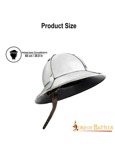 The wide brim, a main characteristic of the design, protects from above and around the head, allowing freedom of movement without sacrificing coverage in simulated combat or position defense, ideal for those facing long shifts in reenactments or parades.