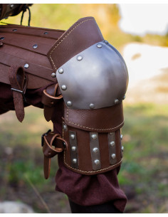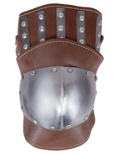 Crafted from deep-looking brown leather and accented with silver-plated steel, this piece transforms traditional materials into a reliable defense. The riveted metal cap and vertical straps reinforce the upper part, protecting the joint while maintaining an elegant profile that does not overshadow the outfit.