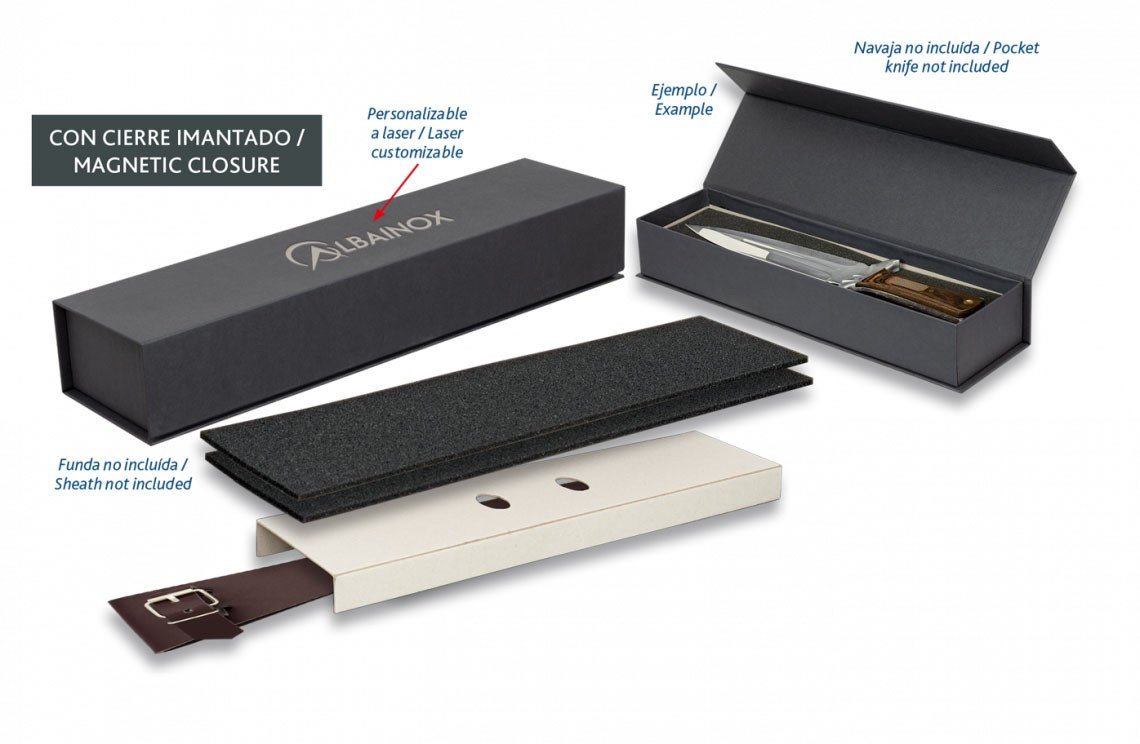 Present your Albainox knives or penknives safely and elegantly with the Exhibition Box with Magnet Closure. This box has been specially designed to highlight your collection pieces. With a separate compartment for sheath storage, this box offers a complete solution for displaying and protecting your knives or razors.