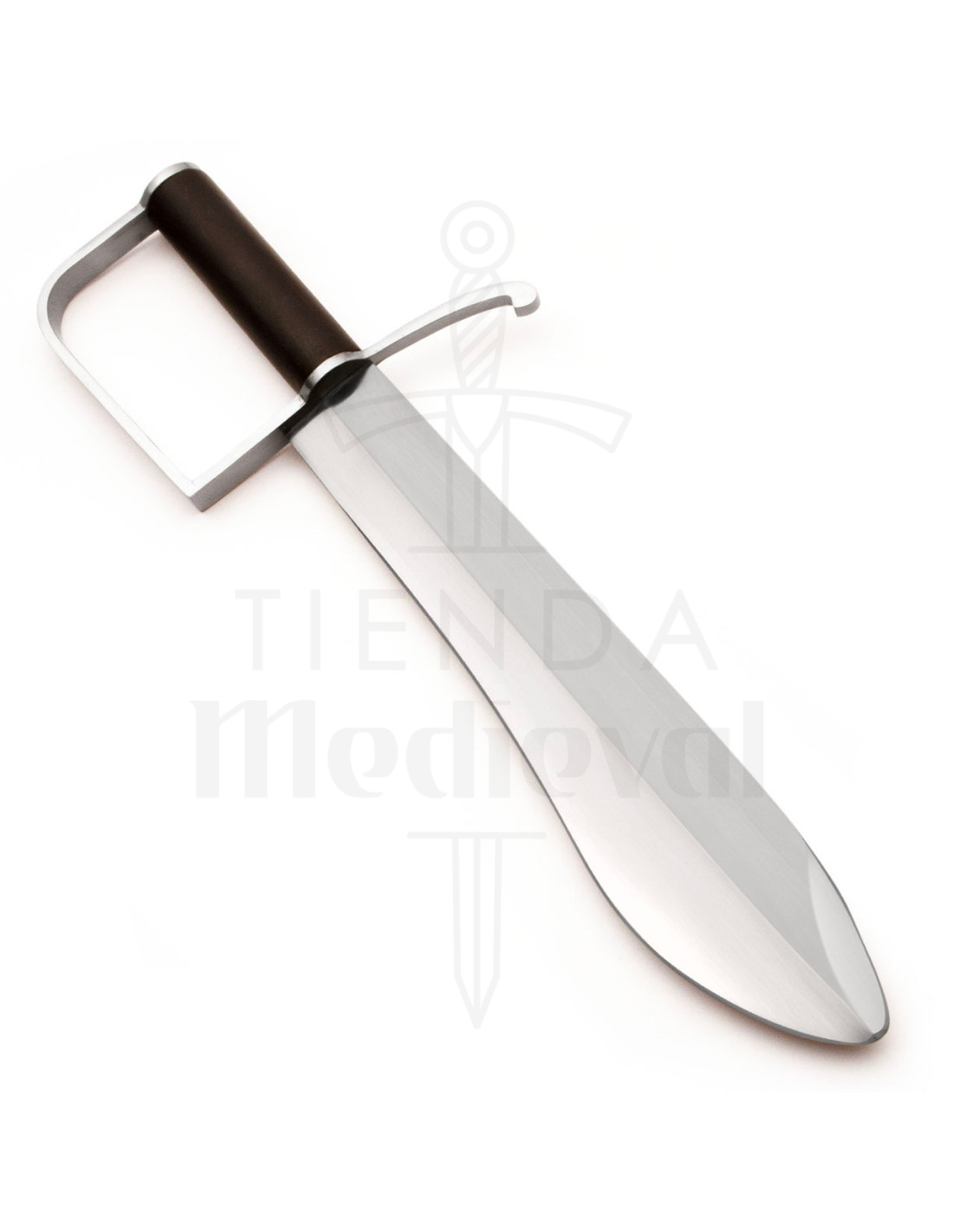 More than just a reproduction, it is a piece intended to instill confidence in use and comfort in carry. The cylindrical grip, dyed in dark brown, allows for a natural and secure hold, and the angular guard protects the fingers during demanding maneuvers. The slightly rounded tip and the hollow ground bevels enable powerful and controlled cuts, transforming the blade into a machete-like tool with great potency.
