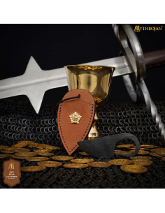 The brown leather sheath, dyed and hand-stitched, protects the blade while adding character. The black stitching and the metallic emblem inspired by medieval motifs, along with the relief of the golden lion in the shape of a shield, make this piece an accessory that stands out both in reenactments and private exhibitions.