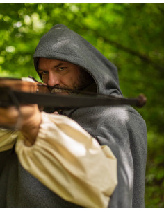 Discover the Raven model wool Renaissance cape in an elegant gray color. The ""Raven"" cape is a loyal companion in various situations and weather conditions. Cut loosely and shorter at the front than at the back, it offers great freedom of movement and guarantees comfort when wearing it. Arm openings allow you to use your hands comfortably without having to carry the cape over your shoulder or take it off. In addition, it has internal zippers that keep the openings closed when you are not using them.
