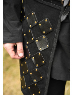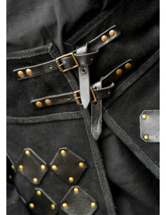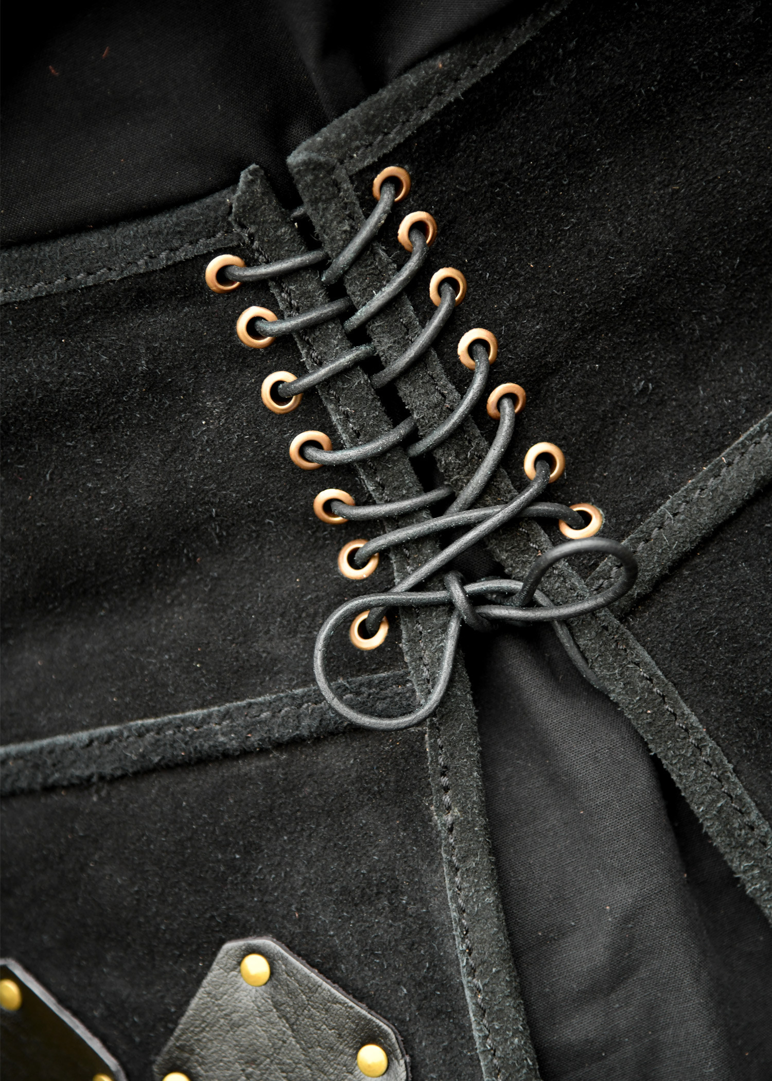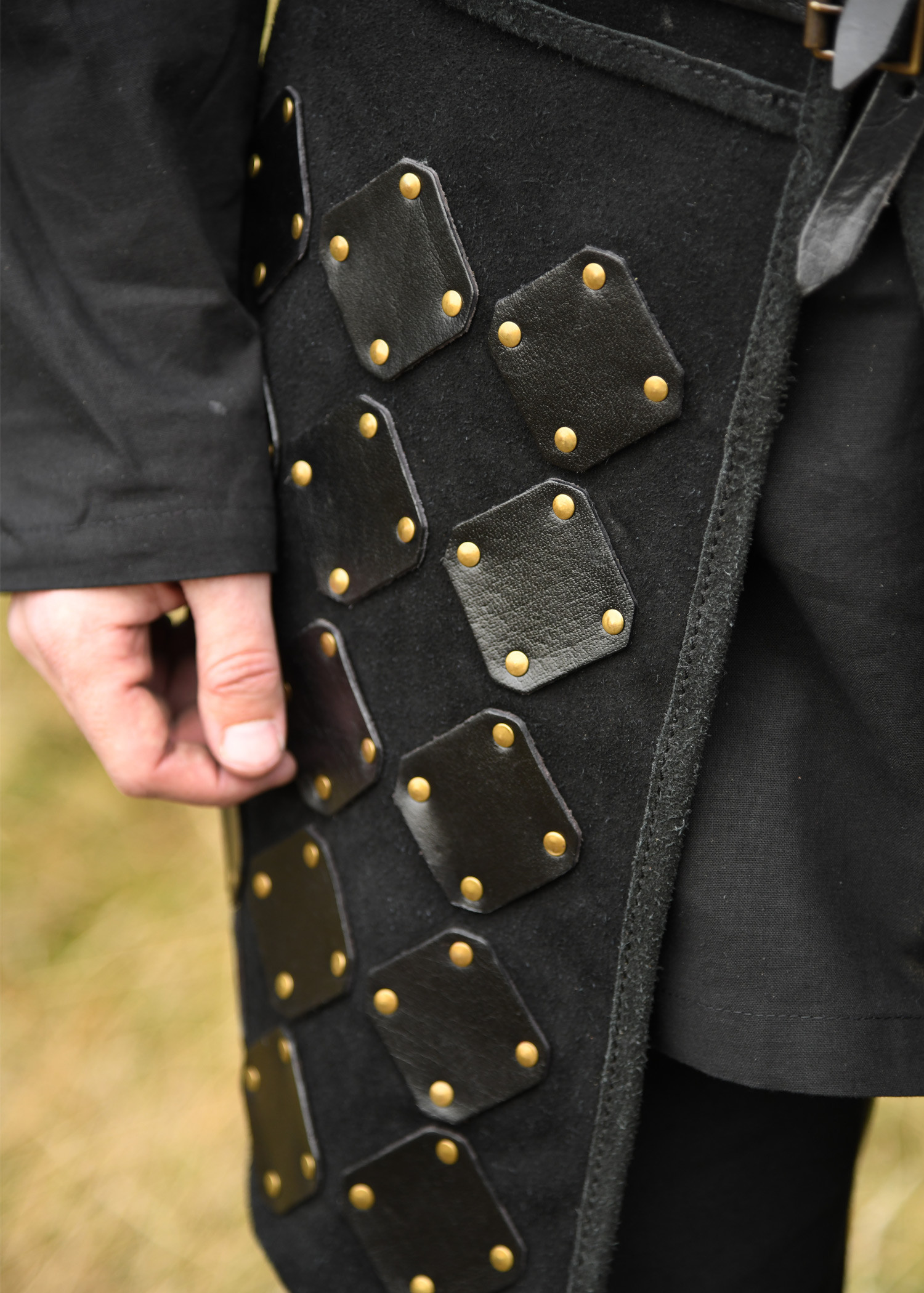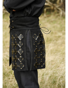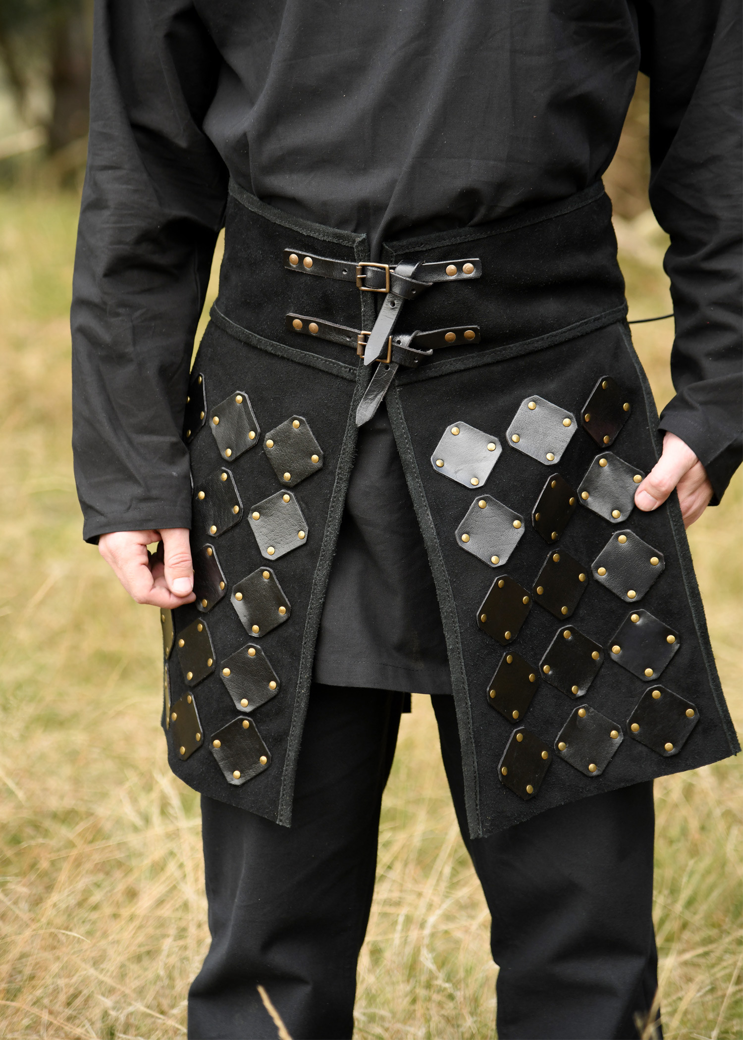 Made of black vegetable-tanned suede, this skirt offers exceptional freedom of movement and notable durability. The sturdy grain leather panels, riveted for a robust finish, provide an armor-like appearance that will prepare you for any battle. The tassets adjust around the hips with two adjustable leather straps and buckles, ensuring a secure and adaptable fit. Additionally, the cord at the back not only adds an attractive detail but also enhances comfort.
