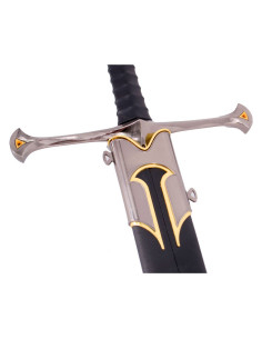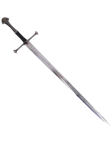 The steel blade, with a shiny finish, is adorned with runes that evoke the rich and epic history of Tolkien's universe. These runes not only add a touch of authenticity but also reference the ancient tales of Middle-earth, allowing you to remember the heroic deeds of its bearers every time you gaze upon the sword. With a thickness of 5 mm, the blade provides a sense of robustness and solidity, perfect for those looking for a replica that can be admired up close.