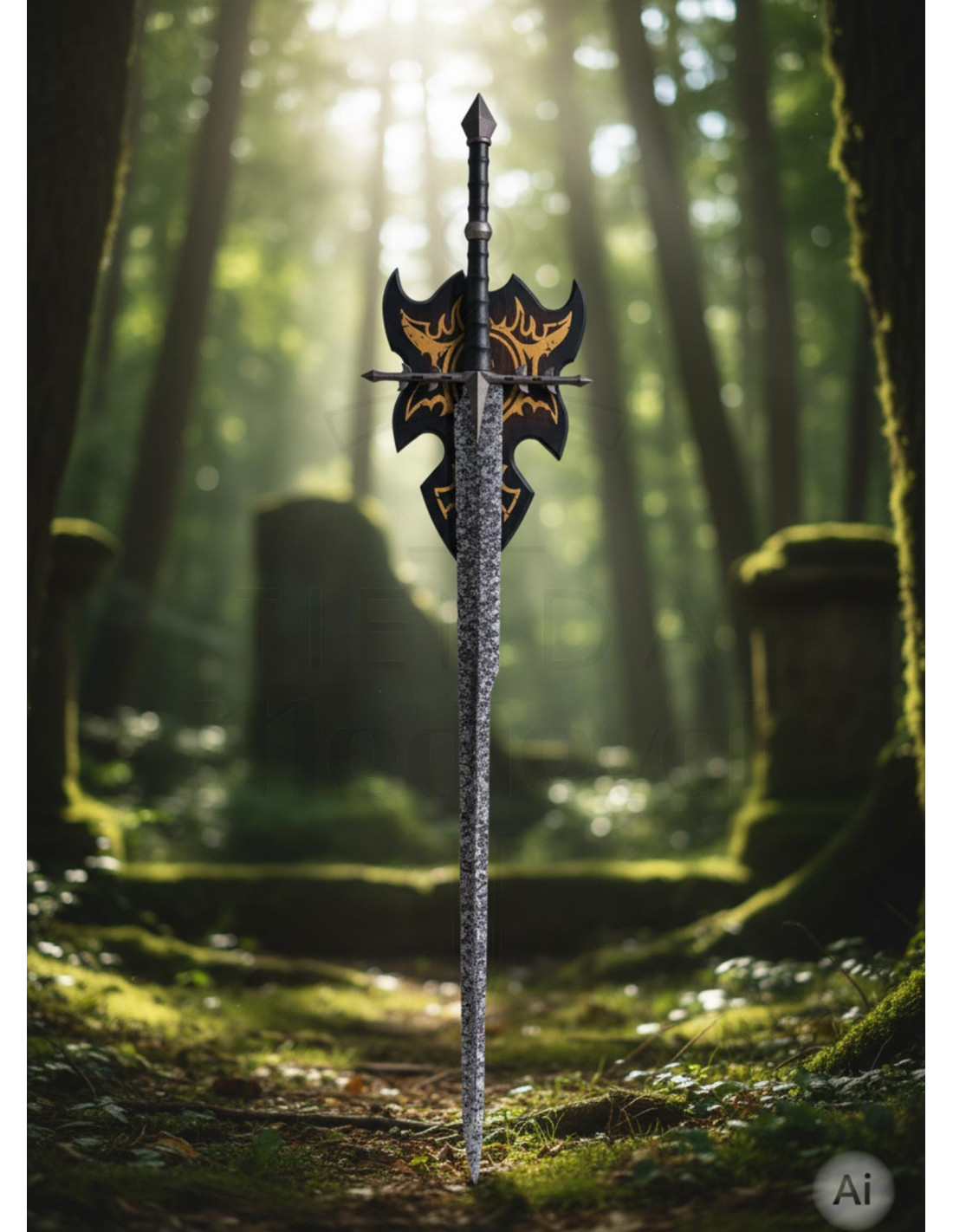 The blade, made of steel with a worn finish and aged edge, combines durability and aesthetics, achieving an antiqued effect that will captivate collectors and enthusiasts alike. The guard and pommel in metallic nickel provide an elegant contrast, while the black handle ensures a sturdy look and a comfortable grip for wall display thanks to its included stand. Additionally, weighing 1600 grams, it is stable yet lightweight for its size, making it easy to handle visually or ceremonially.