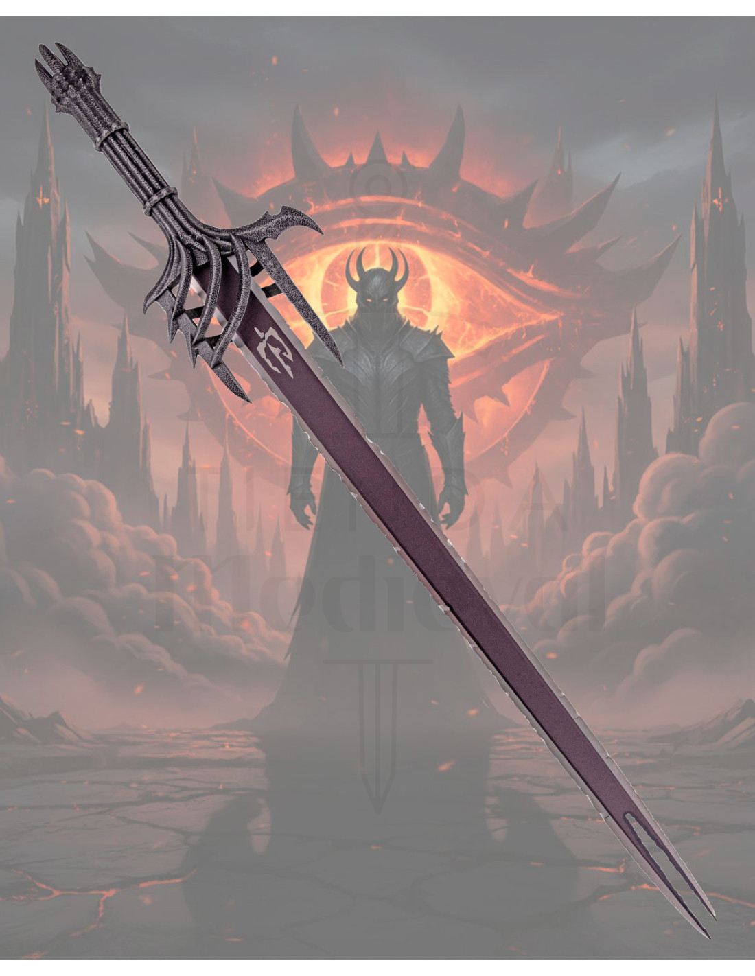 This unofficial Sauron sword from the Rings of Power series offers an aggressive and theatrical appearance that elevates your collection, thanks to its steel blade with a gray finish and satin edge, reflecting light with a sinister and authentic air. The combination of black and dark gray tones creates a deep visual effect, while the central engraving and edge details add character and personality, not just decoration.