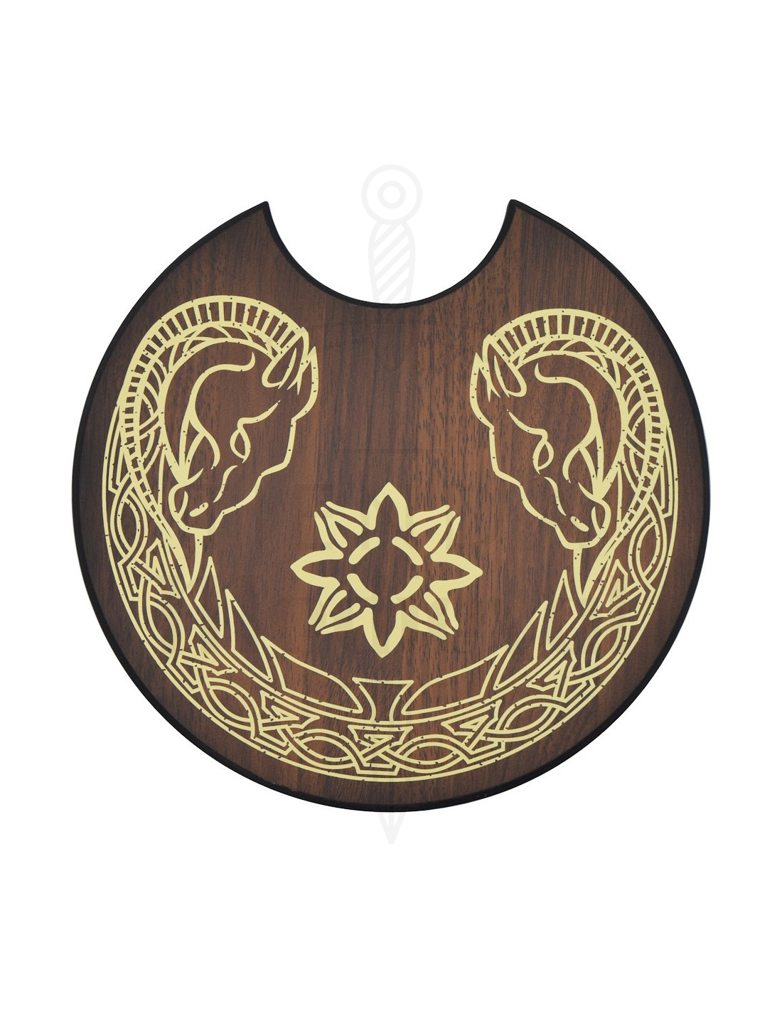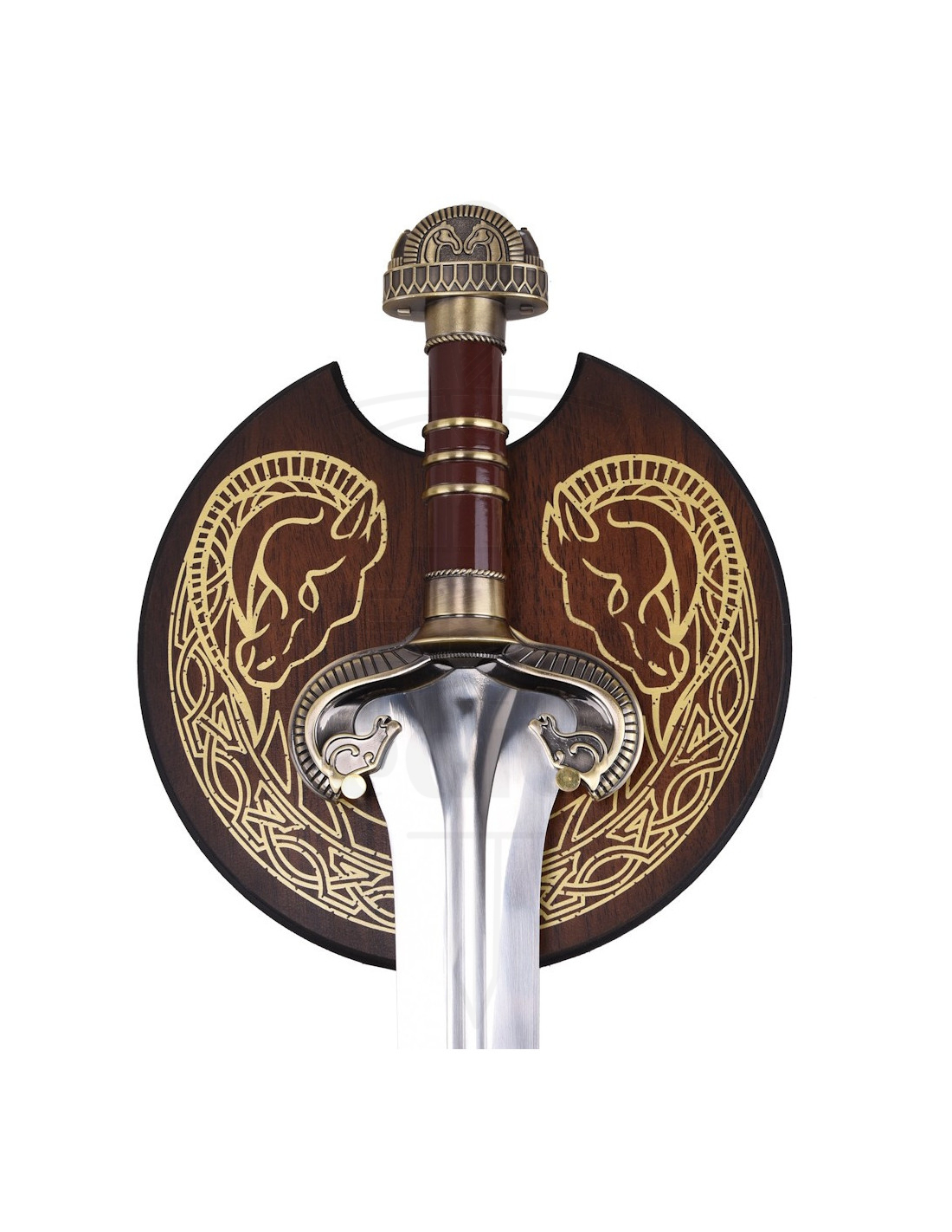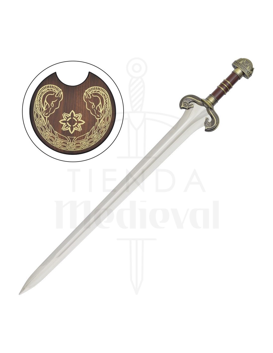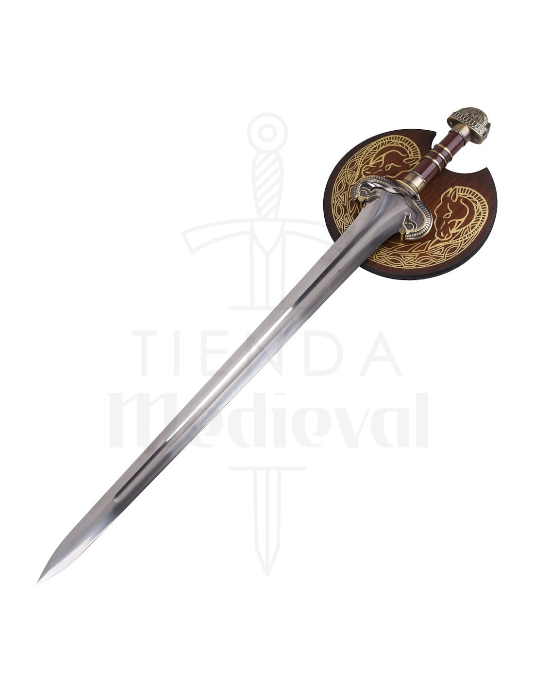 This replica captures that intensity: a silver blade with a central line running its length, creating a uniform and elegant shine, accompanied by a guard and pommel in aged bronze that feature ornamental details of stylized heads. The dark wooden grip, finished with golden rings and a weave-like texture, adds a warm touch and visual authenticity, while the dark wooden wall mount with golden motifs allows it to be displayed as if it were a treasured heirloom.
