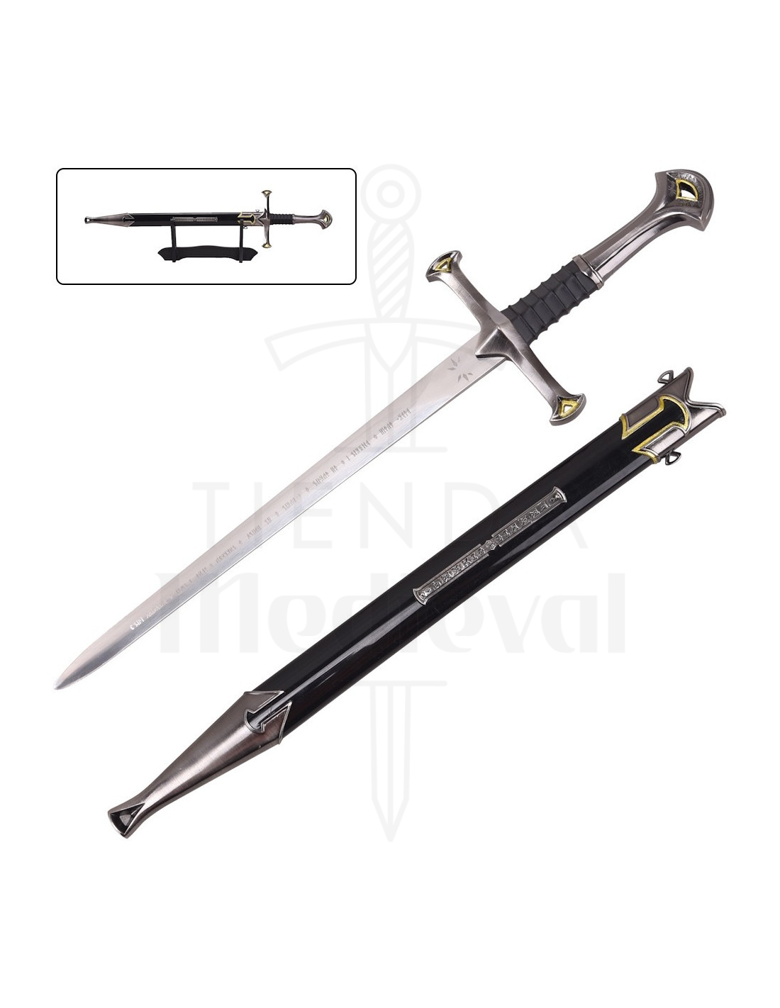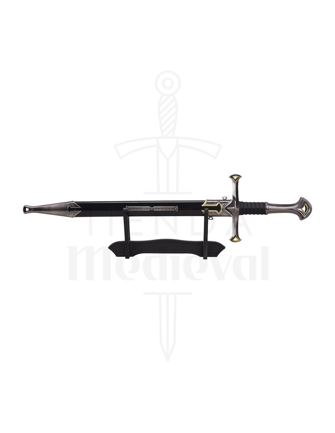 The sheath, with its decorative final guard, and the included stand facilitate immediate presentation: place the sword on the base to achieve a focal point in any corner without the need for additional accessories. It is a practical solution for collectors and decoration enthusiasts who value having pieces ready to showcase.