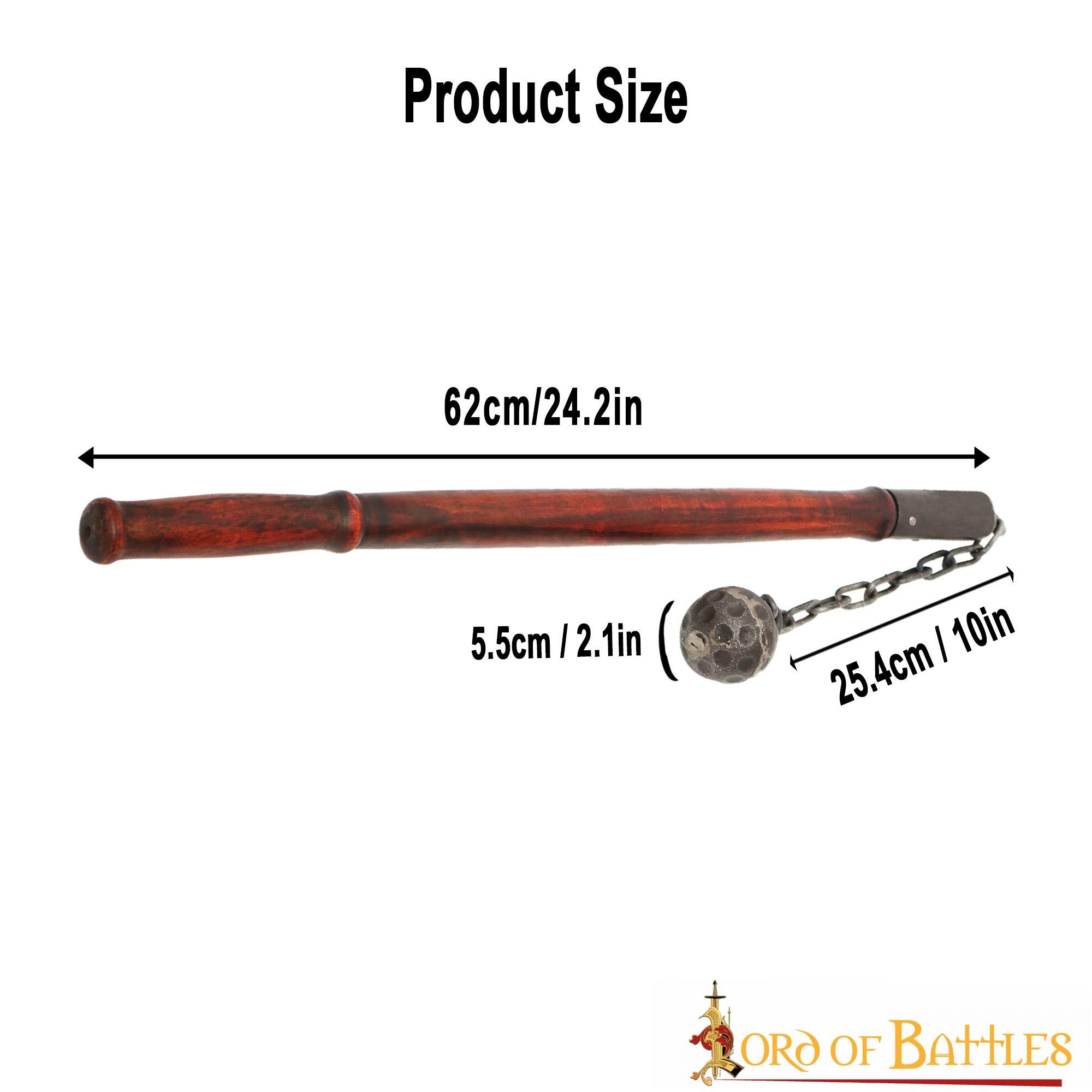 Prepare to strike fear into the hearts of your enemies with our Medieval Mace with Spikeless Ball and Chain! This powerful medieval weapon features a wrought iron ball approximately 5 centimeters in diameter connected to a sturdy iron chain approximately 25 centimeters long (made of 5 mm thick iron, with loops approximately 2.5 cm wide). The approximately 61 centimeters long wooden shaft is designed to offer optimal grip and control. It features a traditional natural finish and is ideal for a soldier or mercenary character.