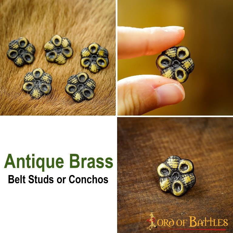 Give a unique and medieval touch to your leather belt or clothing with our set of 5 decorative brass flowers! Each of these stunning pieces, crafted from SOLID ANTIQUE BRONZE with meticulous attention to detail, will transport you back to medieval times in the blink of an eye.