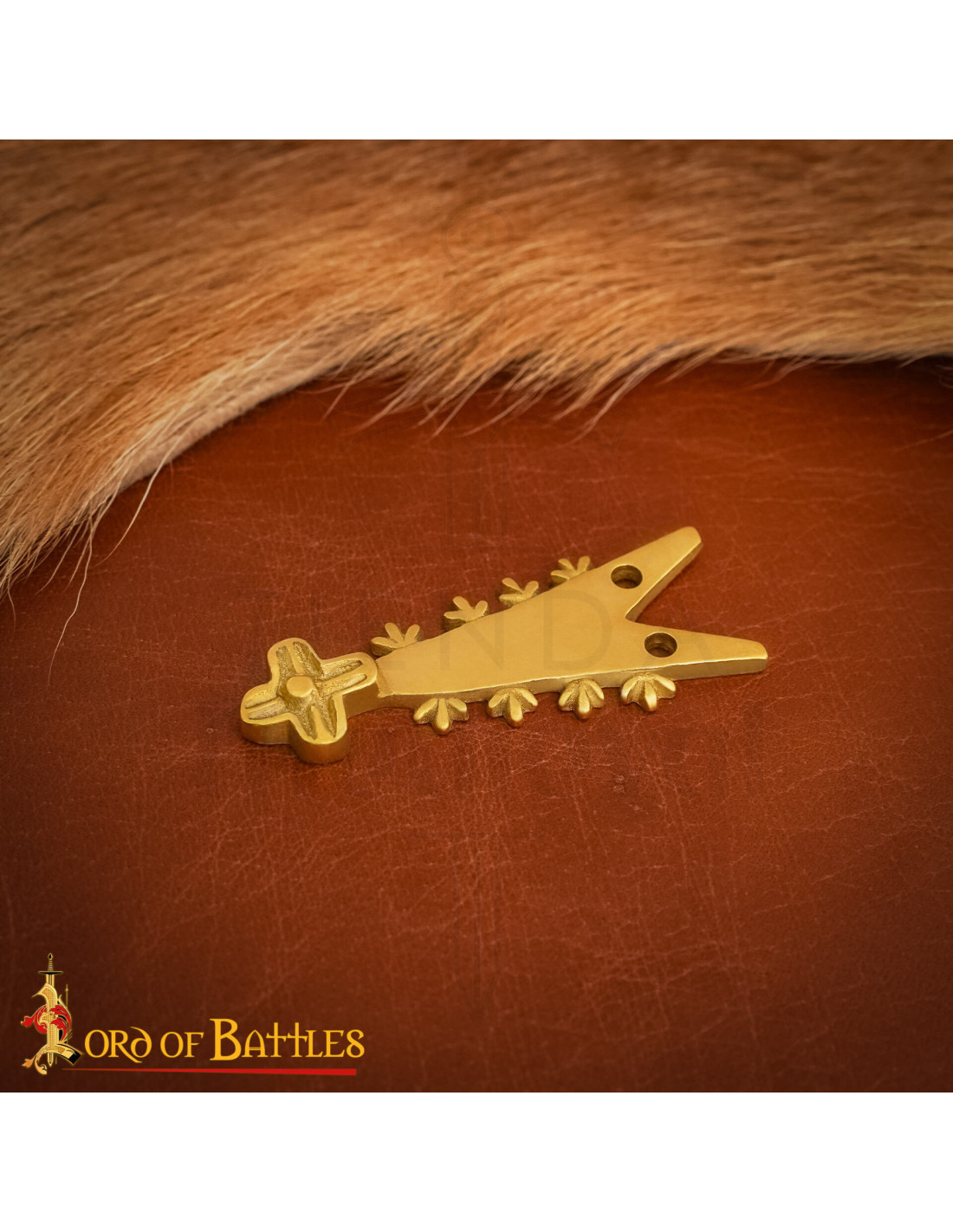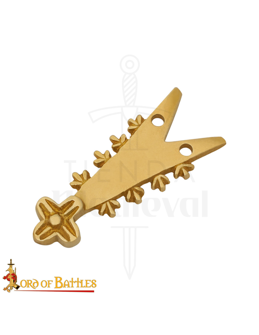 This piece evokes the sophistication of Renaissance workshops, with a uniform shine that stands out against dark leather or earthy tones. Its pointed end bifurcates into two tips with small holes designed for a clean and discreet fastening, while the edges adorned with motifs resembling leaves or teeth add texture and elegance. On the opposite side, a cross with a geometric relief adds character and cohesion to the whole piece.