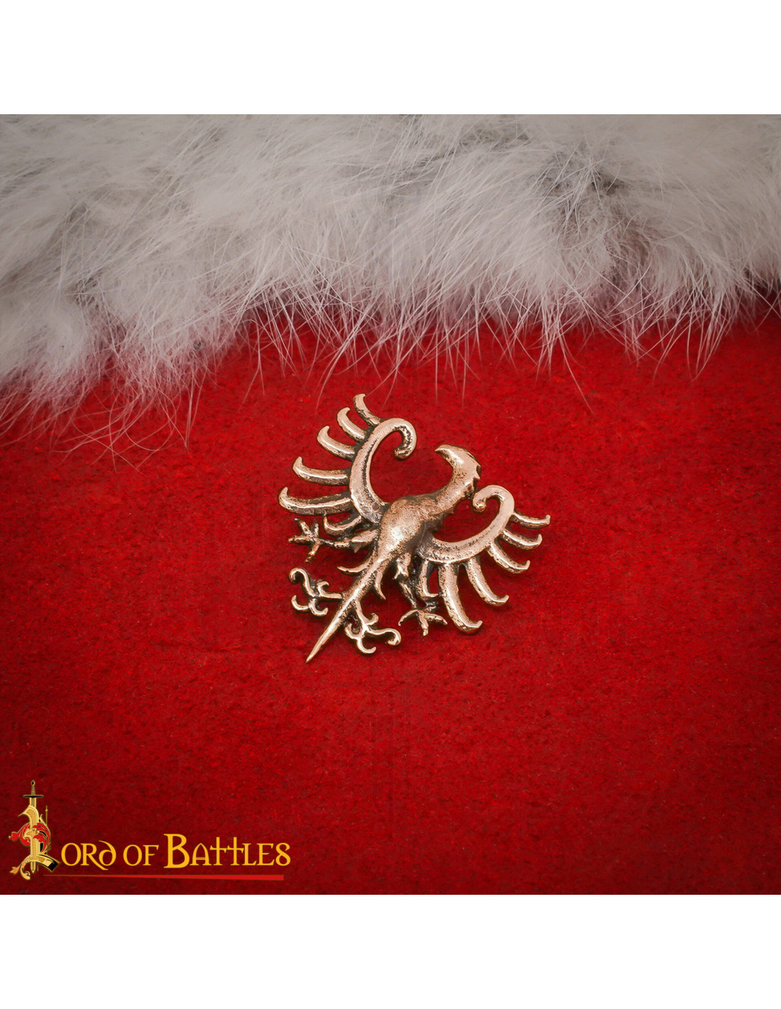 The piece features a single-headed eagle, with its wings spread and feathers intricately crafted, along with claws that add that touch of noble authority. The antique bronze finish and slightly hammered texture enhance its authentic appearance, as if it has emerged from a medieval standard.