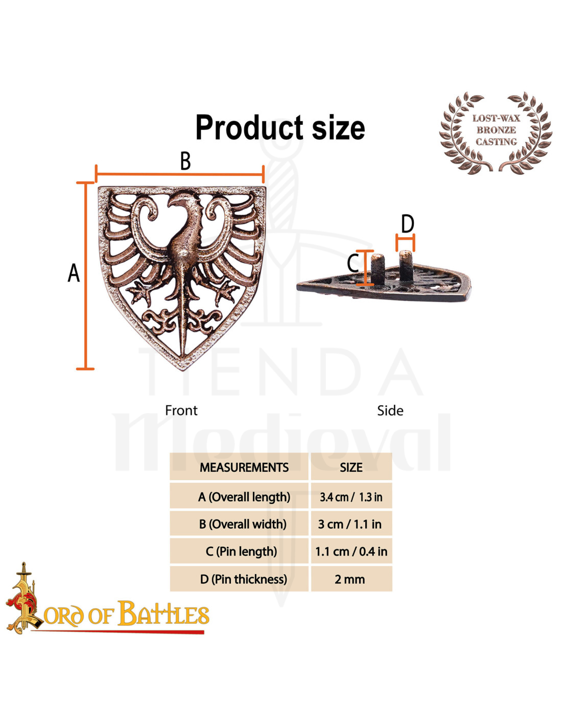 Its double fastening system ensures that it stays firmly in capes, outer layers, tunics, or straps, preventing twisting and detachment during use. Additionally, its compact size makes it versatile, integrating seamlessly with garments and armor without being bulky, ideal for both historical recreations and contemporary looks with a warrior nuance.
