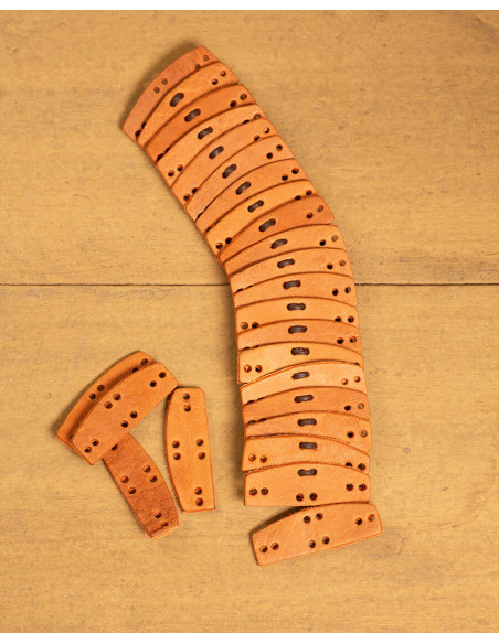 By choosing to purchase the Pack of 25 Leather Plates for Lamellar Armor, Brown, you are adding to your workshop 25 scales designed to facilitate assembly and creativity: their format favors modular setups, from coifs to leg tassets, allowing you to adapt protection exactly where you need it.