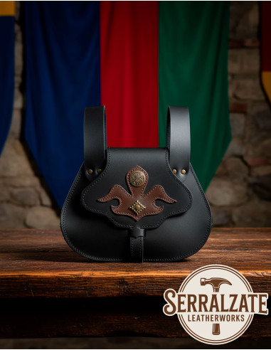 Medieval black leather bag with brown appliqués for belts