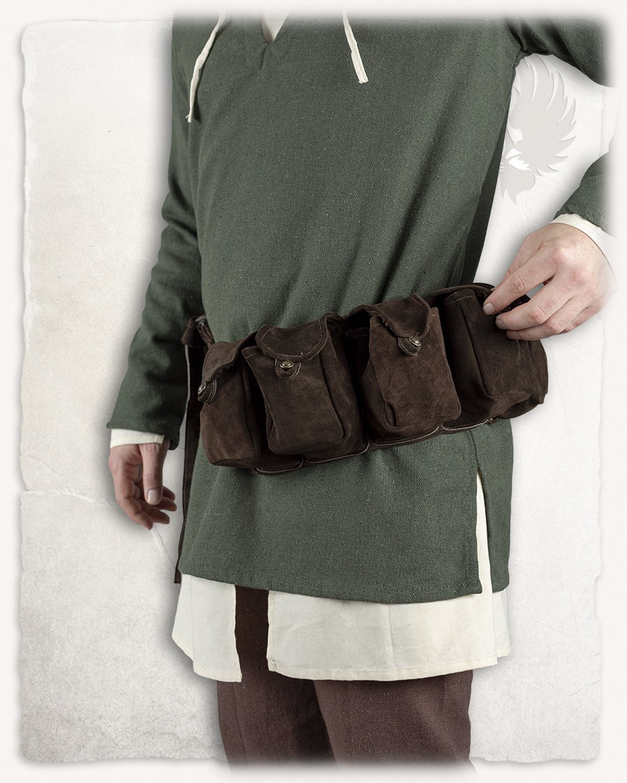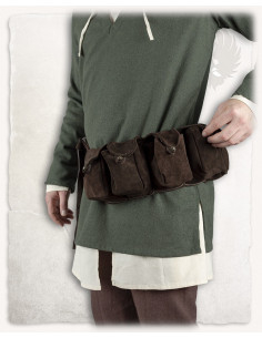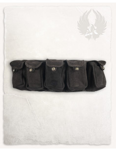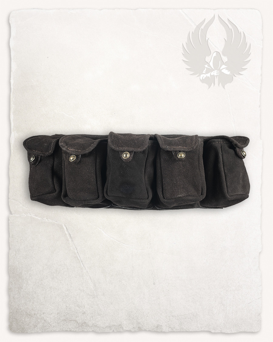 Made of soft suede, this belt stands out for its functional and elegant design. Each of the five pouches is designed with a button closure that simulates the shine of brass, adding a touch of sophistication to your look. Whether you're on an outdoor adventure or simply enjoying a day in the city, this belt adapts to any occasion.