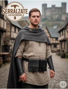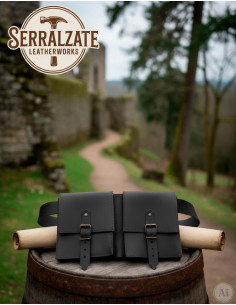 The Medieval Belt Bag DuoPouch in black leather combines traditional design and modern functionality, offering two integrated compartments that allow you to organize personal items clearly and accessibly. When you carry it, you'll notice how its genuine leather adapts and gains character with use, conveying an elegant and crafted presence that discreetly attracts attention.