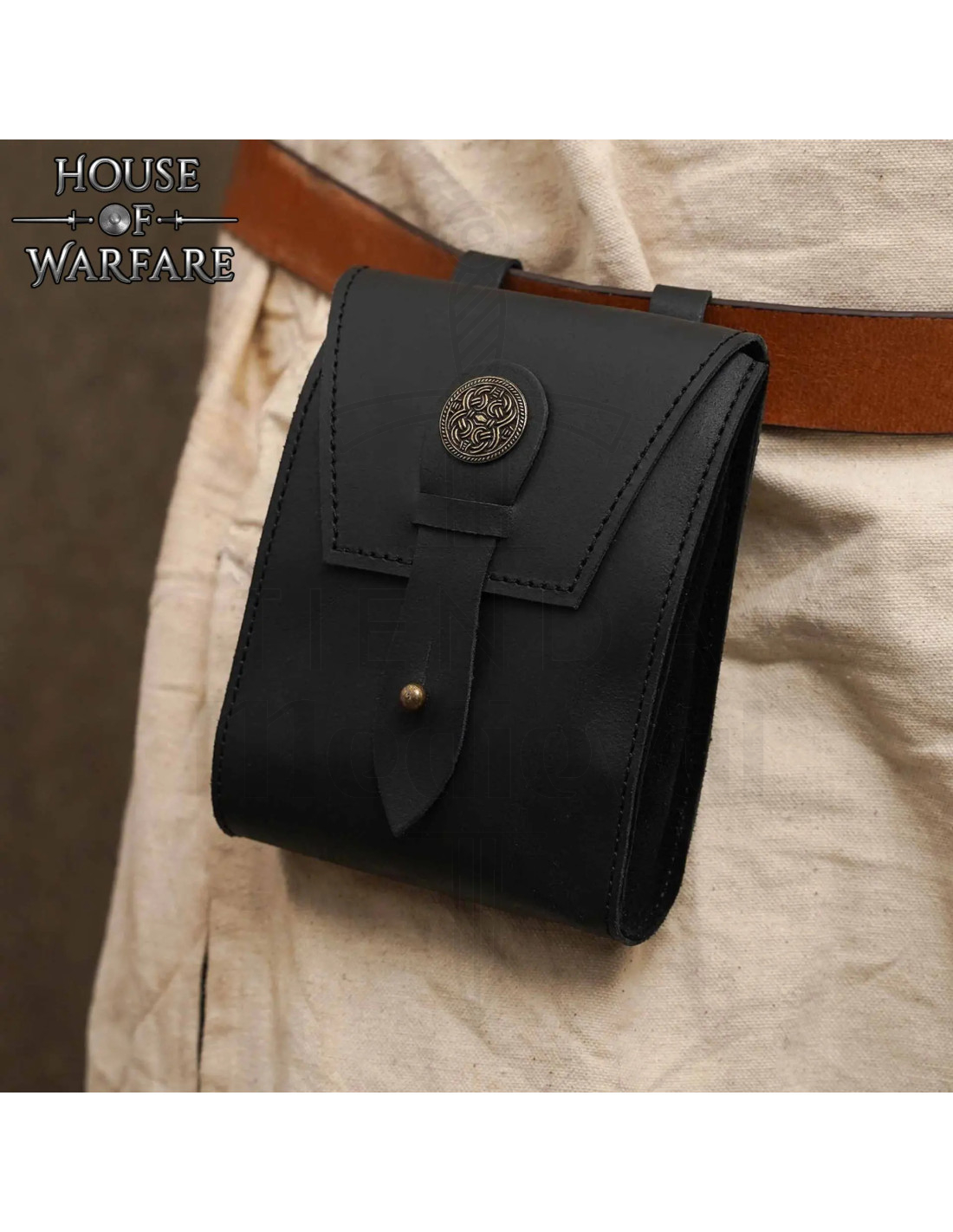 The two reinforced rear straps allow it to be attached to wide belts and battle or reenactment structures, fitting securely without shifting. Inside, it holds essentials: coins, dice, small relics, secret notes, or a compact phone, all organized and protected within a clean, structured silhouette.