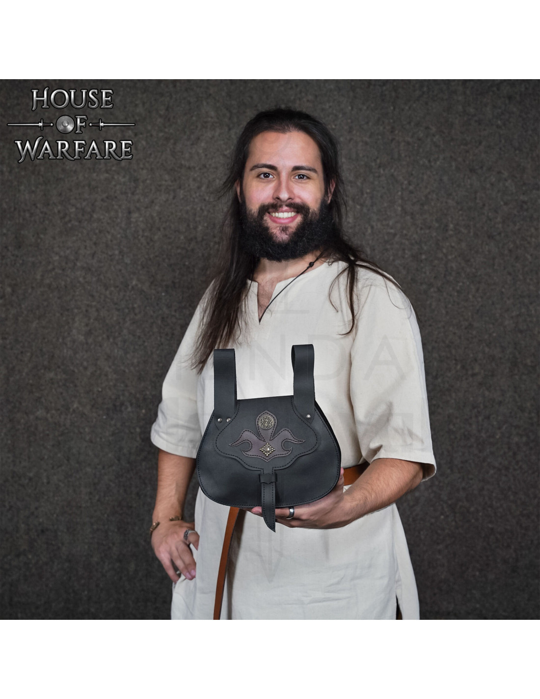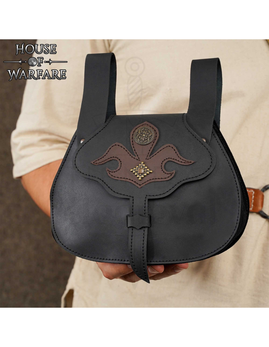 The traditional closure, a leather strap inserted into a loop, keeps the contents secure in a simple and silent way, ideal when you need discretion on the move. The two wide straps at the top allow it to be attached to broad belts, ensuring stability during choreographed fights, travels, or performances, without uncomfortable shifting.