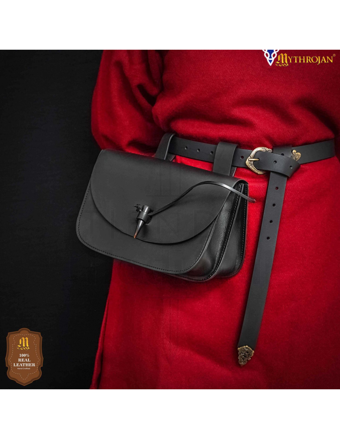 The smooth black finish, with visible stitches reinforcing the edges, adds sobriety and apparent durability, ideal for pairing with medieval-themed outfits, historical reenactments, or urban looks inspired by past eras. Its simple design avoids unnecessary adornments, promoting versatility and a presence that adds character without overloading.