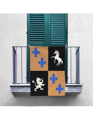 Banner Medieval Quartered with Crowns in various sizes. Made of polyester of 110 gr double-stitched at the ends. Come prepared with tape reinforcement and two rings clamping on the side of the mast.