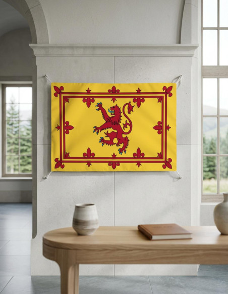 The Royal Standard of the King of Scotland is the flag historically used by the King of Scotland. This banner, with dimensions of 70x100 cm, presents an impressive lion rampant gules, tongued and clawed in azure, on a yellow or gold background, surrounded by a double border decorated with fleurs-de-lis gules.