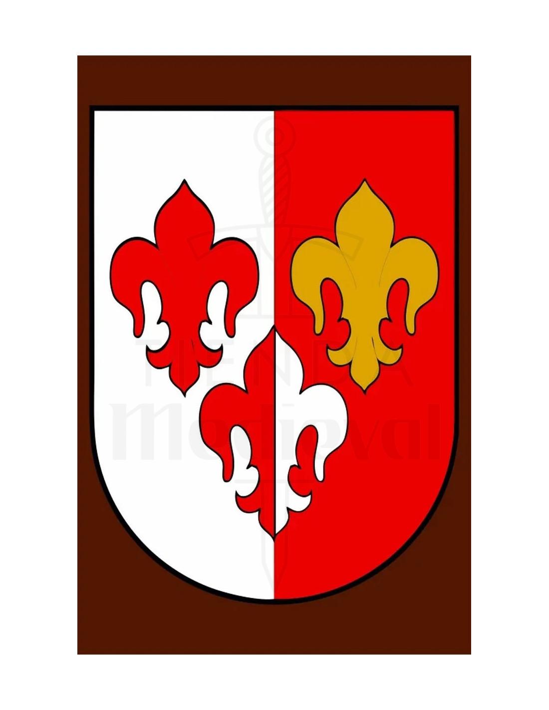 This Medieval Banner with 3 Fleur-de-Lis, 75 x 50 cm stands out with its design divided into two halves, one white and one red, creating contrast and presence. On the white half appears a red fleur-de-lis, while the red half features two fleur-de-lis, one gold at the top and one white at the bottom, all framed by a black outline that enhances every detail against a brown background, adding depth and character to any wall.