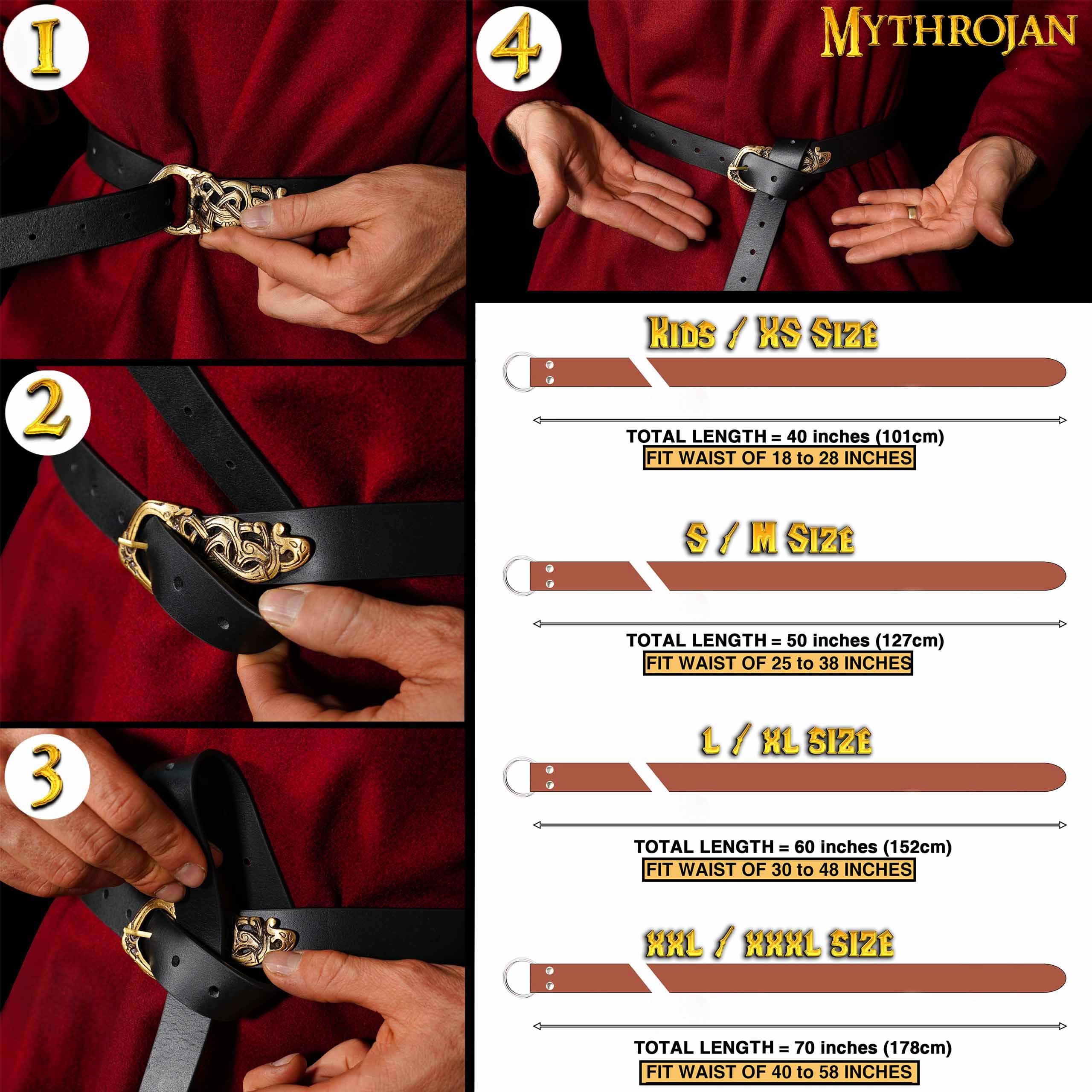 Viking belt for boys handcrafted from strong and attractive full grain leather. The Midgard Serpent model is perfect to complement the next outfit of your little Viking warrior. At Mythrojan we pride ourselves on the quality of our products, which is why we hand cut and craft each belt using only the highest quality leather available. We want your child to look their best on their Viking adventures.
