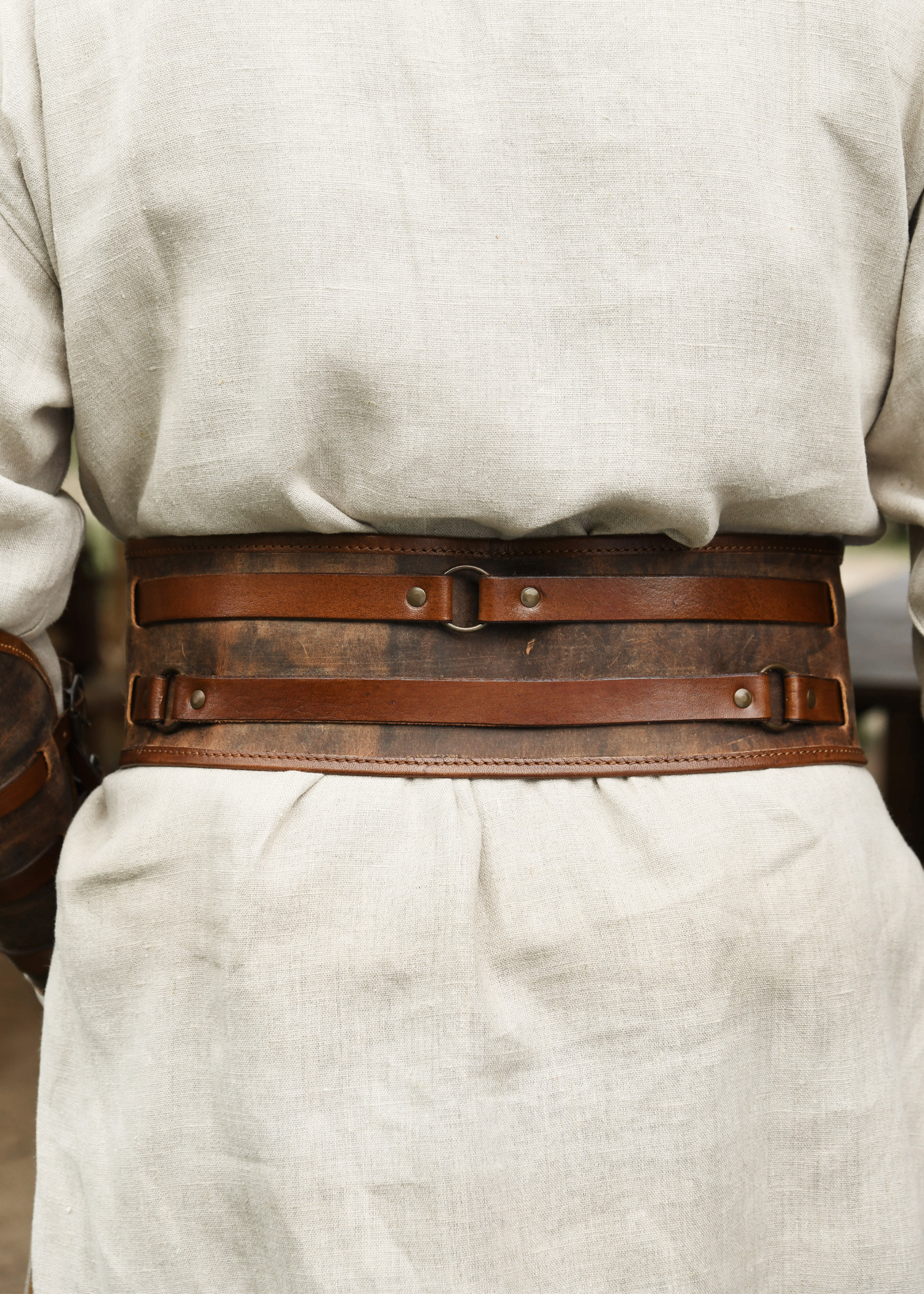 The antique-finished brass buckles and the metal rings integrated into the straps allow for comfortably securing useful items such as bags, tools, or even weapons. This makes the belt both a practical and stylish piece, perfect for historical reenactments or LARP events.
