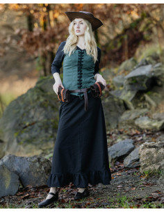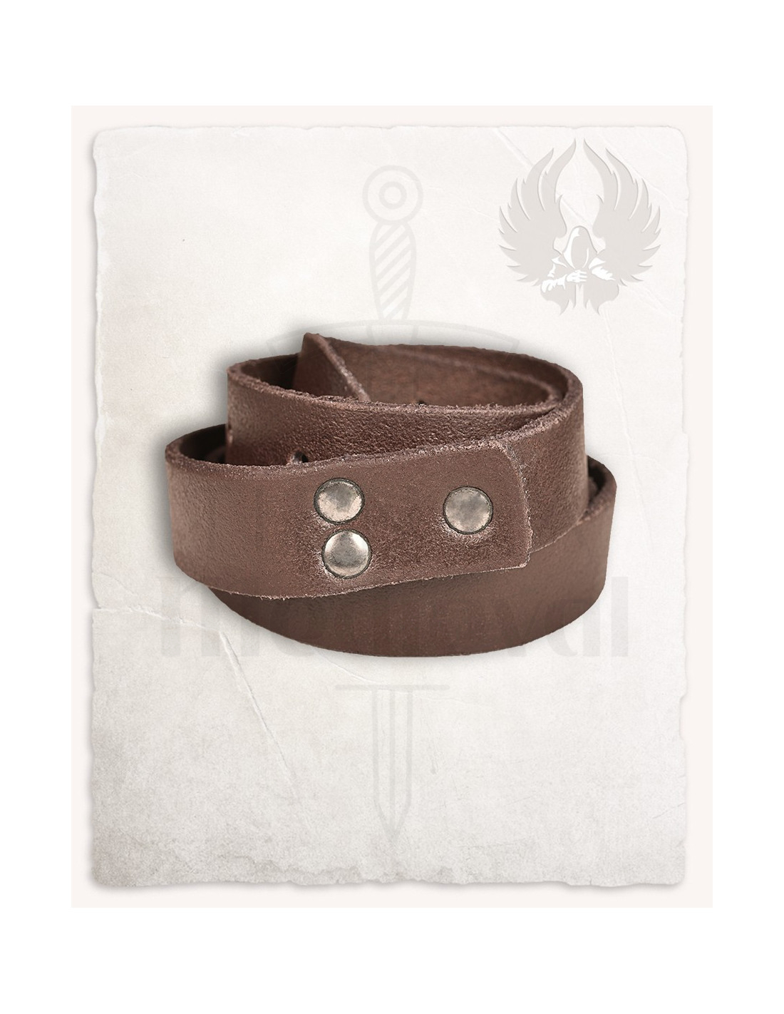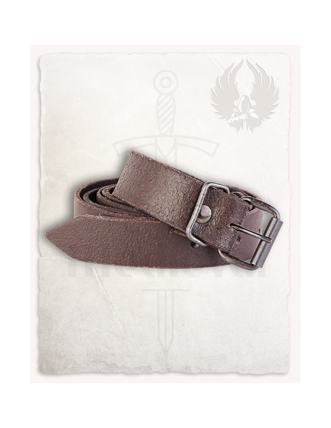 Are you looking for a belt that combines simplicity and functionality to complete your medieval look? This fine medieval leather belt, model Doran, is the perfect choice. Its classic design, with a silver-finished metal buckle, adds an elegant touch without complications, ideal for different characters or styles. Made with high-quality riveted leather parts, its slightly rough texture not only conveys durability but also an authentic and versatile character.