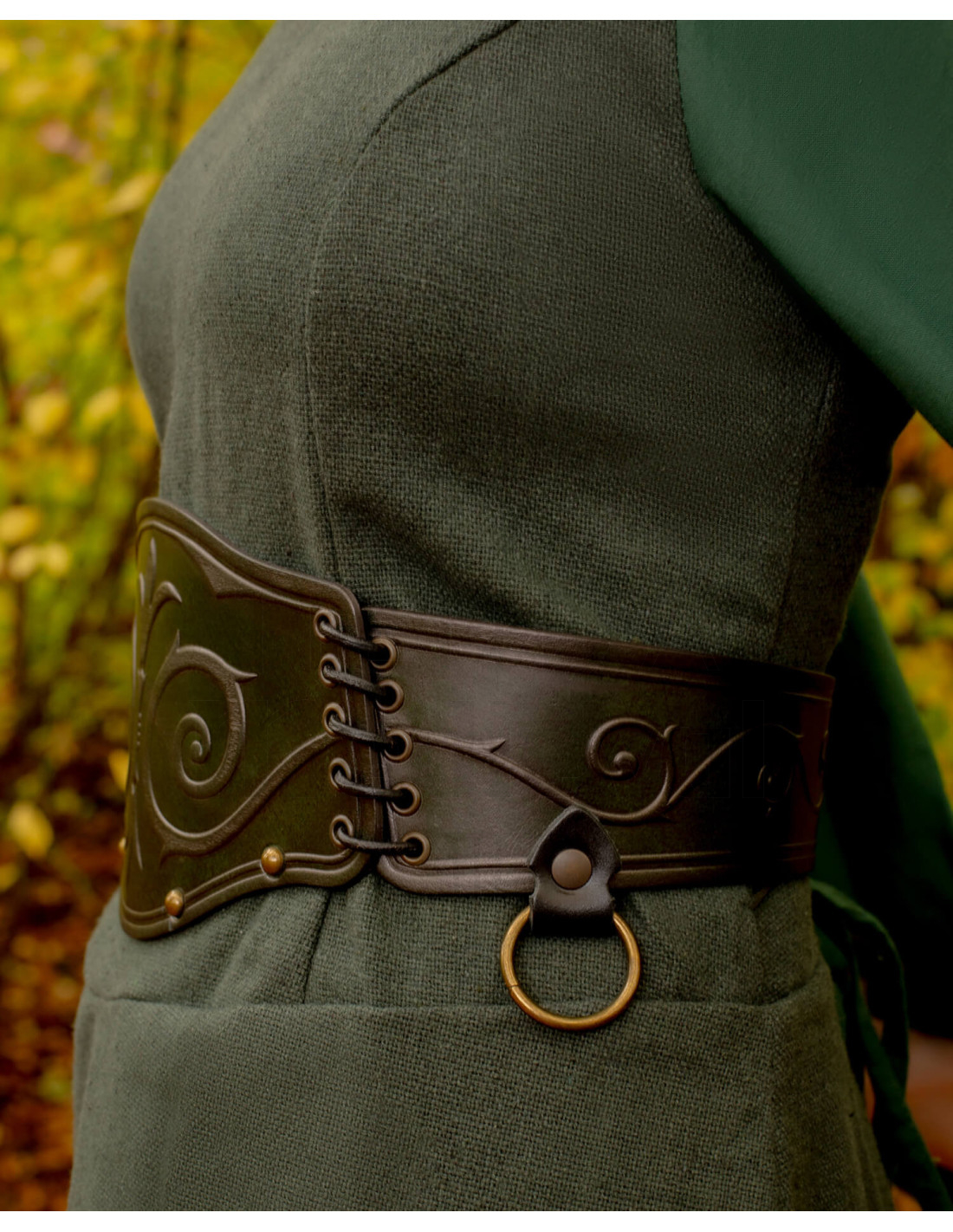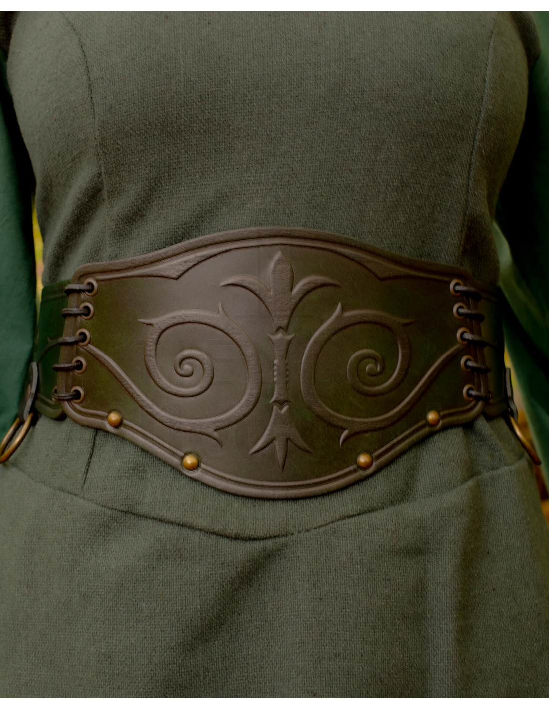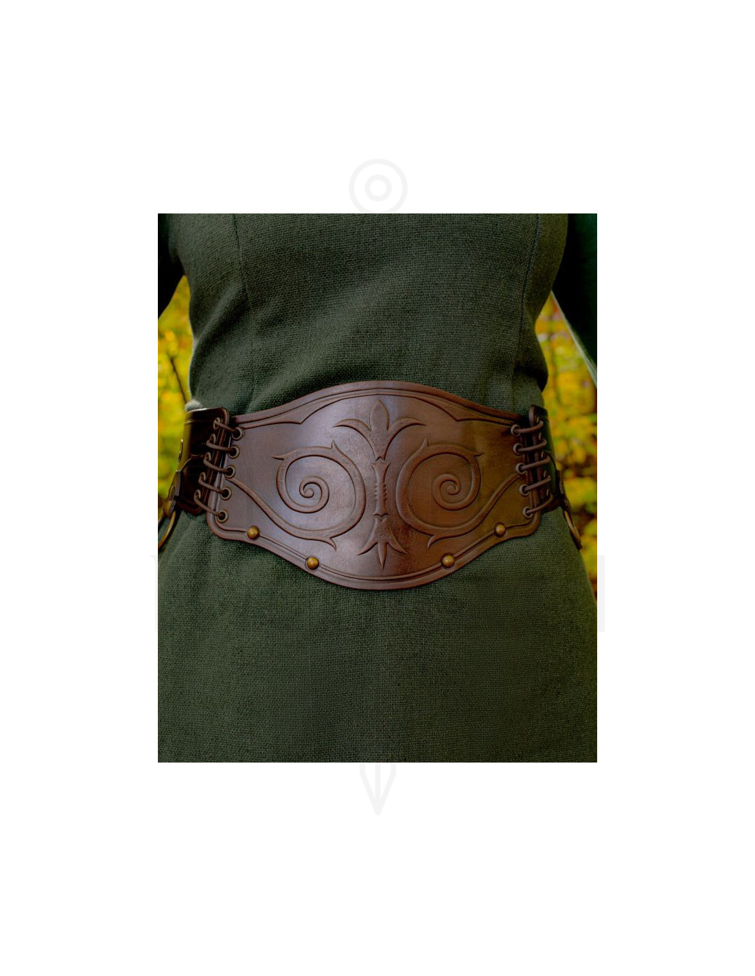 This wide leather belt features an intricately carved motif of spirals and stylized shapes on its front, designed to enhance your silhouette without sacrificing functionality. The smooth, polished finish of the leather gives it an artisanal and durable appearance, perfect for those seeking a refined and characterful presence in reenactments or special occasions.
