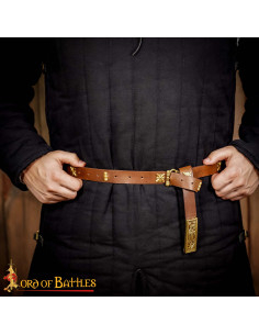 The combination of smooth brown leather with golden mounts in the shape of a cross or flower creates a refined contrast, working well both in photographed close-ups and in movement on stage. Check the size guide to choose the perfect fit and take advantage of a piece that adds history and presence to your recreations or displays.