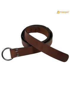 The simple design, with no visible holes along the strap, and the metal ring buckle secured with two rivets, make it easy to hang and reattach accessories, while also providing a solid anchor for your weapon or sheath. The straight end with slightly rounded corners and the interior tone being darker complete a thoughtful look designed to complement medieval or fantasy armor, capes, and garments.