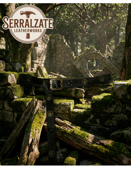 The embossed metal rosettes and the square buckle with architectural air provide visual prominence, creating rich contrasts that elevate any ensemble. The aged bronze finish adds depth and character, while the triple rivets reinforce the joints to ensure the piece withstands frequent use without losing its artisanal aesthetic.